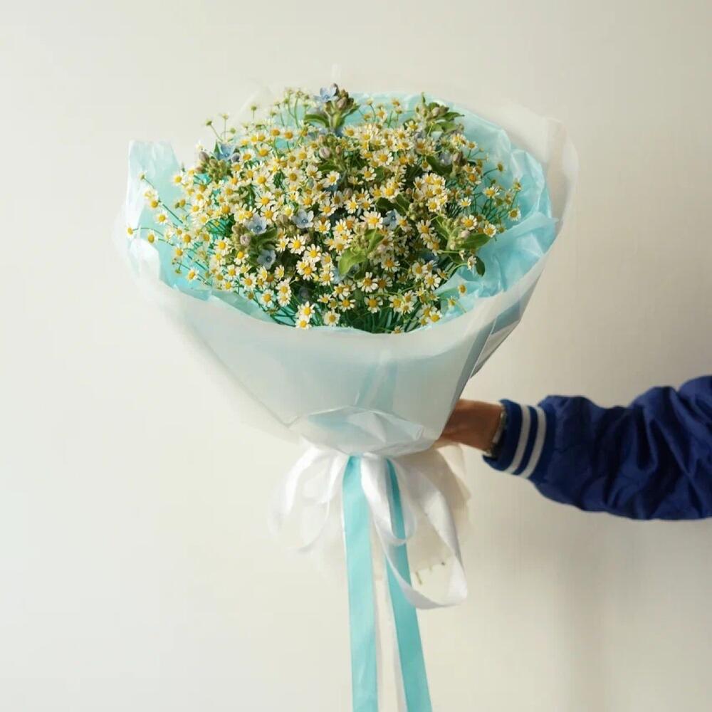 Привет, ромашки! Этот букет – настоящее воплощение летнего настроения и свежести. Яркие желтые цветы ромашек гармонично сочетаются с изящными голубыми оксипеталумами. Будьте уверены, что этот букет станет прекрасным подарком для любого случая: от дня рождения до простых … Показать ещёзнаков внимания. Порадуйте своих близких яркими красками