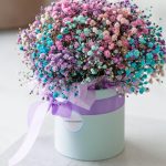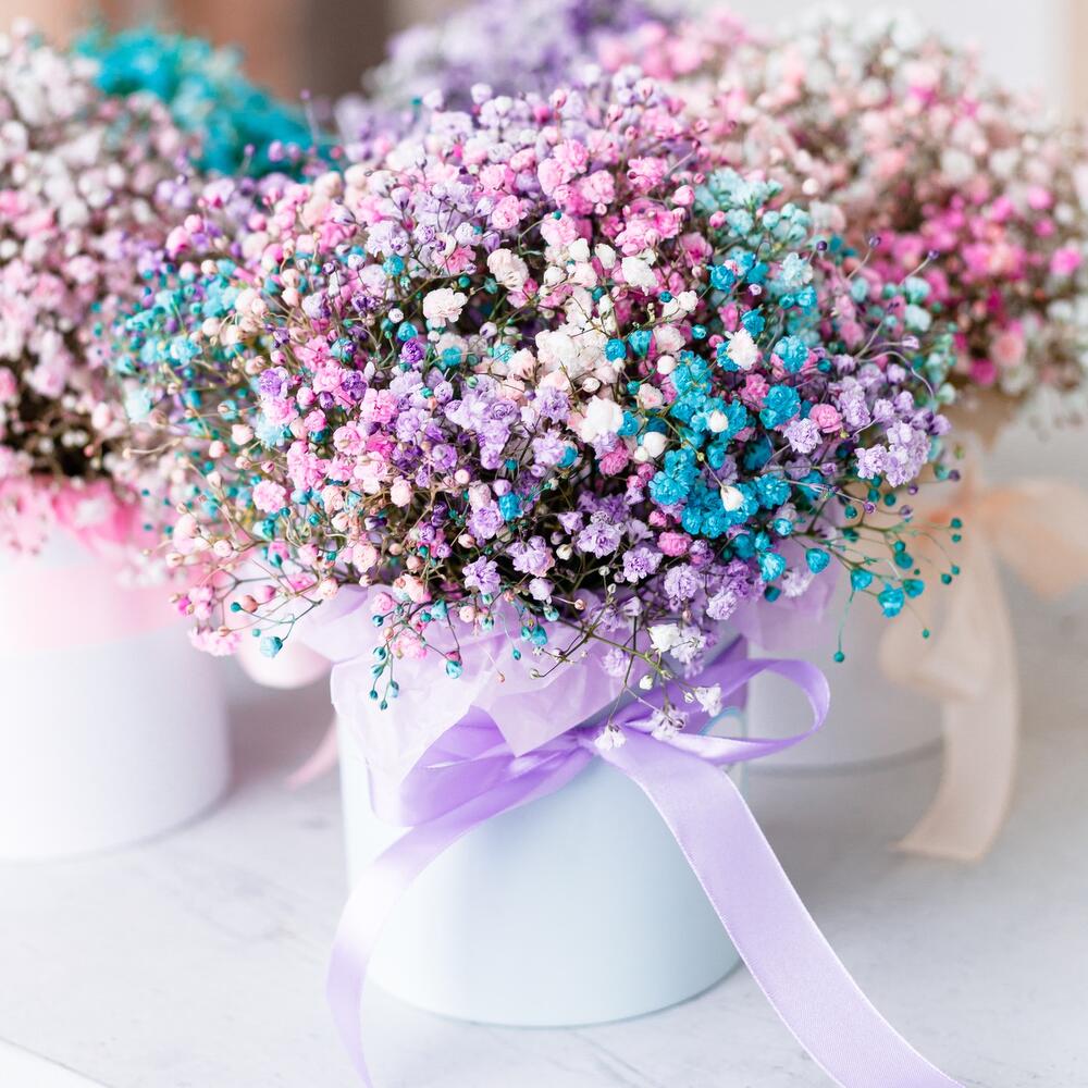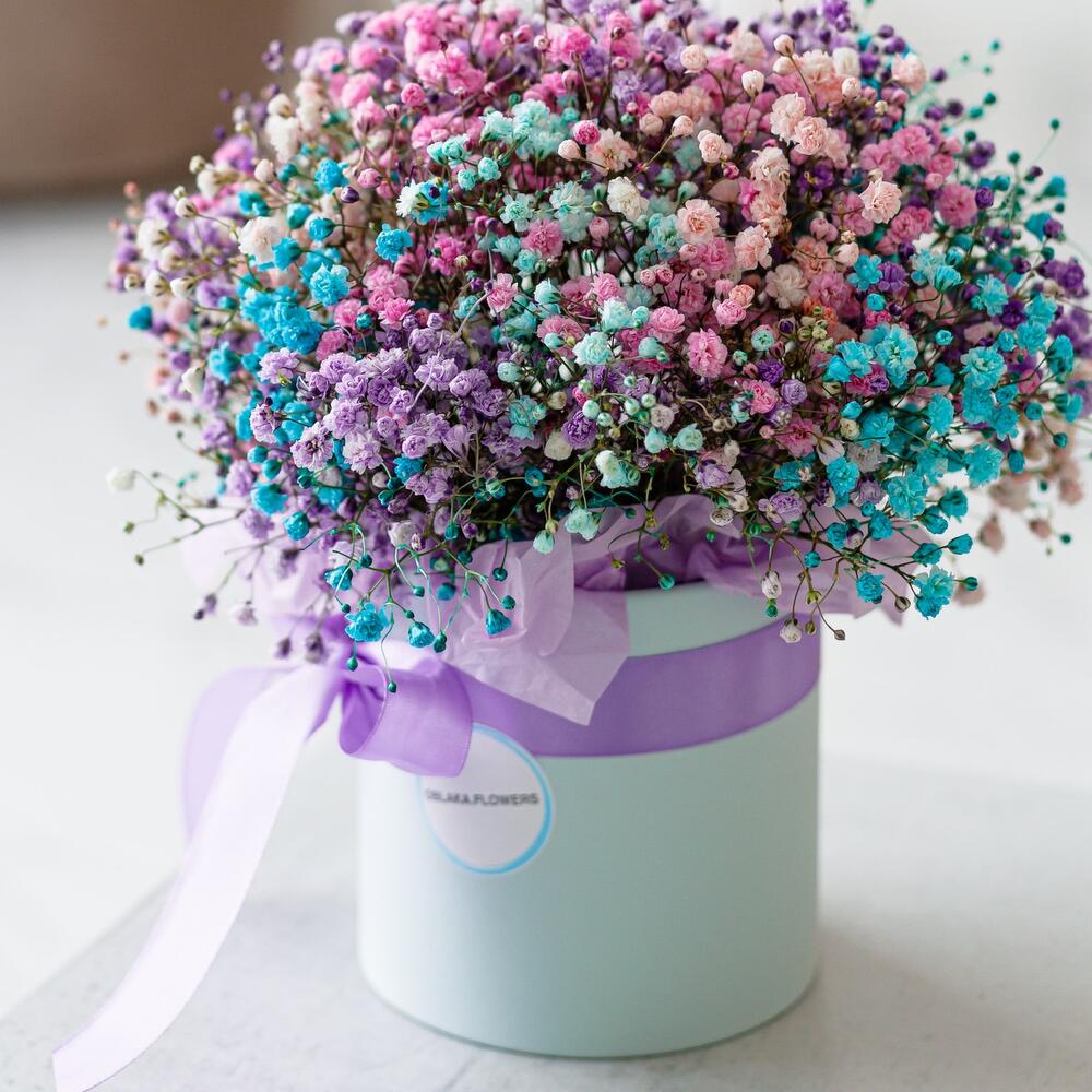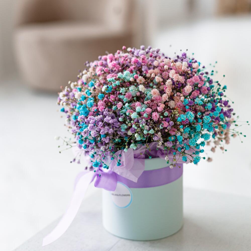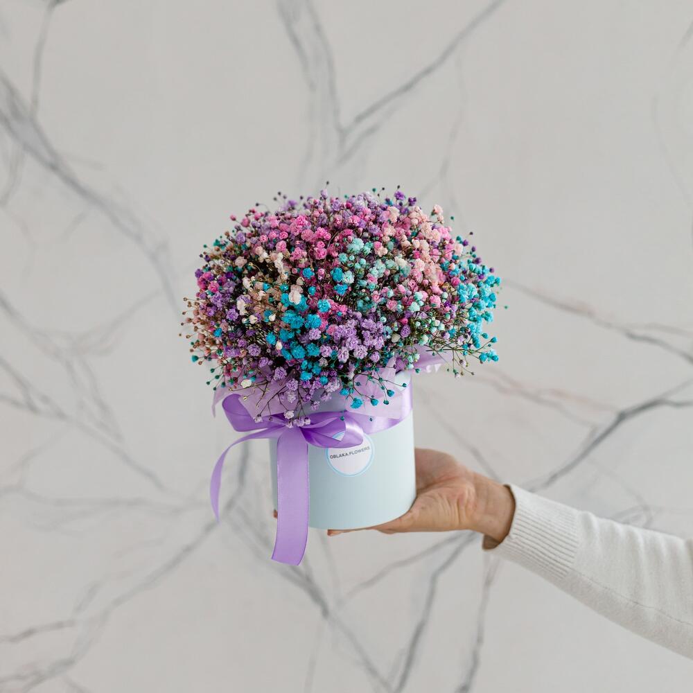 гипсофила цветная – 5 шт.Коробка шляпная – 1 шт.бумага дизайнерская – 1 шт.Лента атласная – 1 шт.Губка флористическая – 1 шт.
