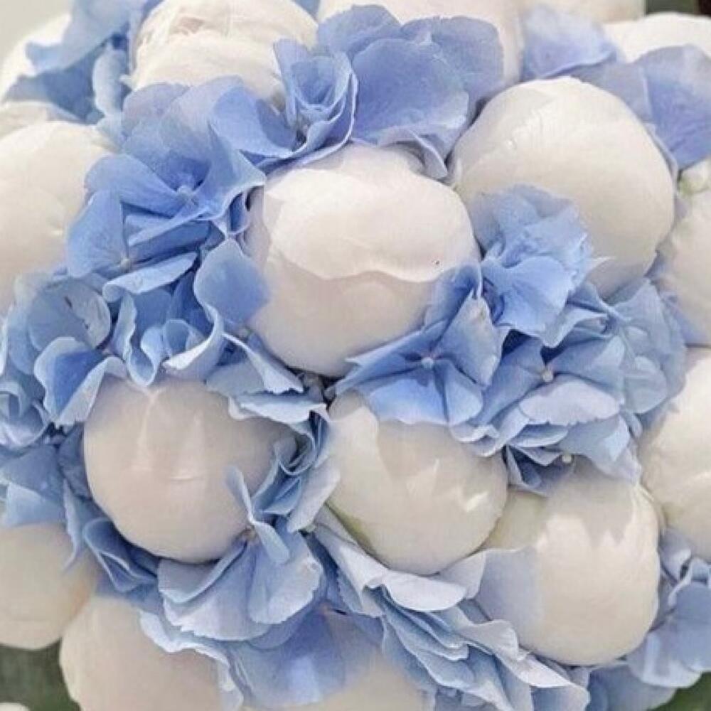 Пион белый – 15 шт.Гортензия голубая – 3 шт.Упаковка дизайнерская – 1 шт.Лента атласная – 2 шт.Открыточка с вашими пожеланиями – 1 шт.хорошее настроение – 100 шт.инструкция по уходу за цветами – 1 шт.коробка переноска – 1 шт.Кризал – 1 шт.