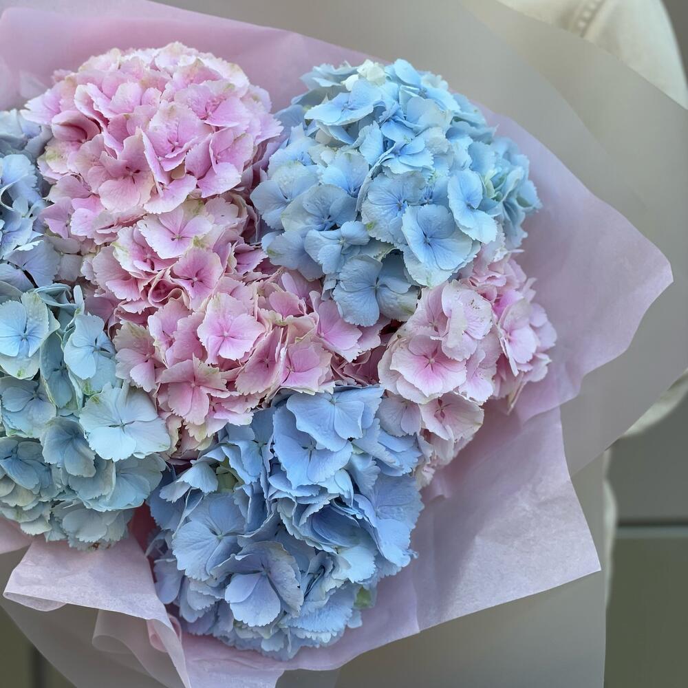 Нежное воздушное облако из микса гортензий Очень объемный букет в воздушной матовой полупрозрачной упаковке