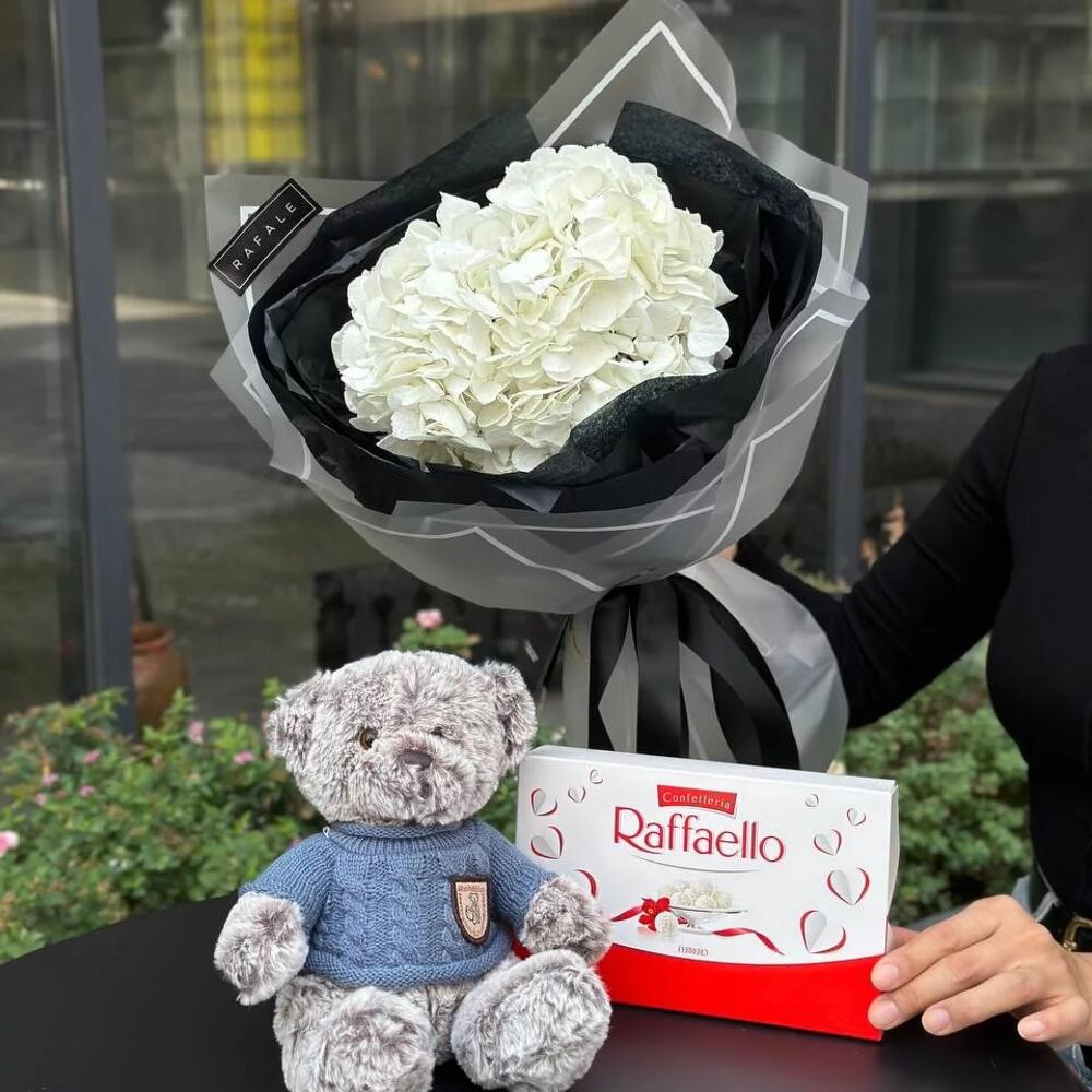 Мишка плюшевый – 1 шт. Raffaello 100 гр – 1 шт. Гортензия – 1 шт.