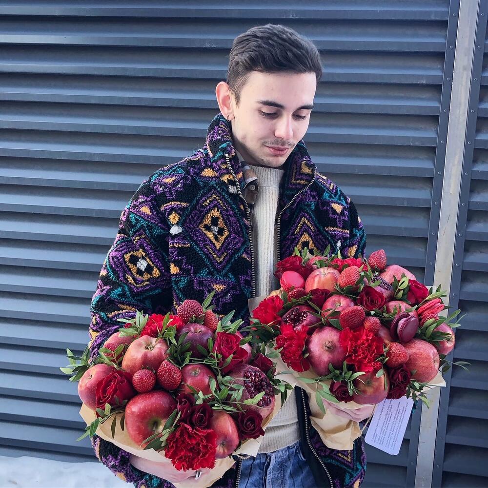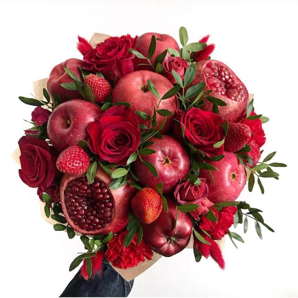 Яблоко – 8 шт.гранаты – 2 шт.Клубника – 5 шт.розы – 3 шт.розы кустовые – 3 шт.гвоздики – 3 шт.зелень фисташки – 2 шт.Лагурус – 6 шт.