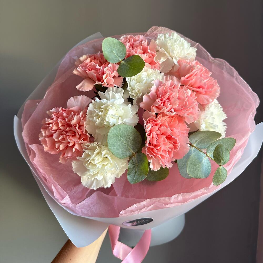 Гвоздика белая – 5 шт. Гвоздика розовая – 6 шт. Эвкалипт – 1 шт.