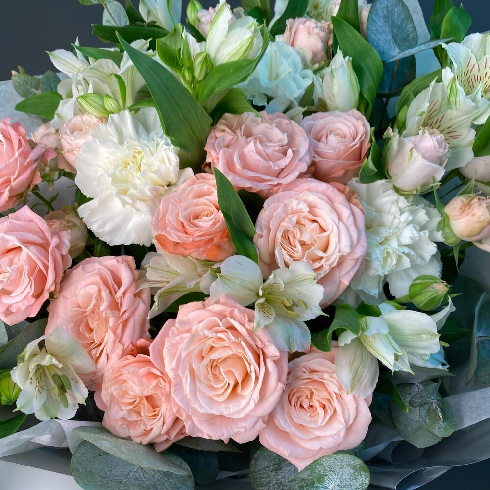 Роза кустовая Бомбастик – 7 шт.Альстромерия Микс Европа – 6 шт.Диантус сортовой – 3 шт.эвкалипт ценария ветка – 7 шт.Упаковка дизайнерская – 1 шт.