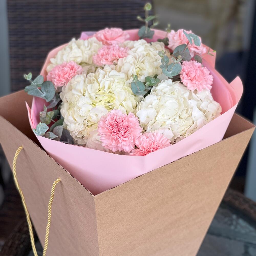 Шляпная коробка гортензией, пионами, эустомой, тюльпанами, гиацинтами, фрезией и гвоздикой