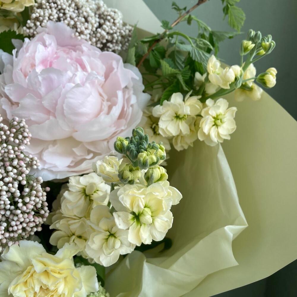 Пион – 5 шт.Паникум – 3 шт.Маттиола – 6 шт.Гвоздика – 3 шт.Озотамнус – 3 шт.Ветки малины – 3 шт.Упаковка – 1 шт.
