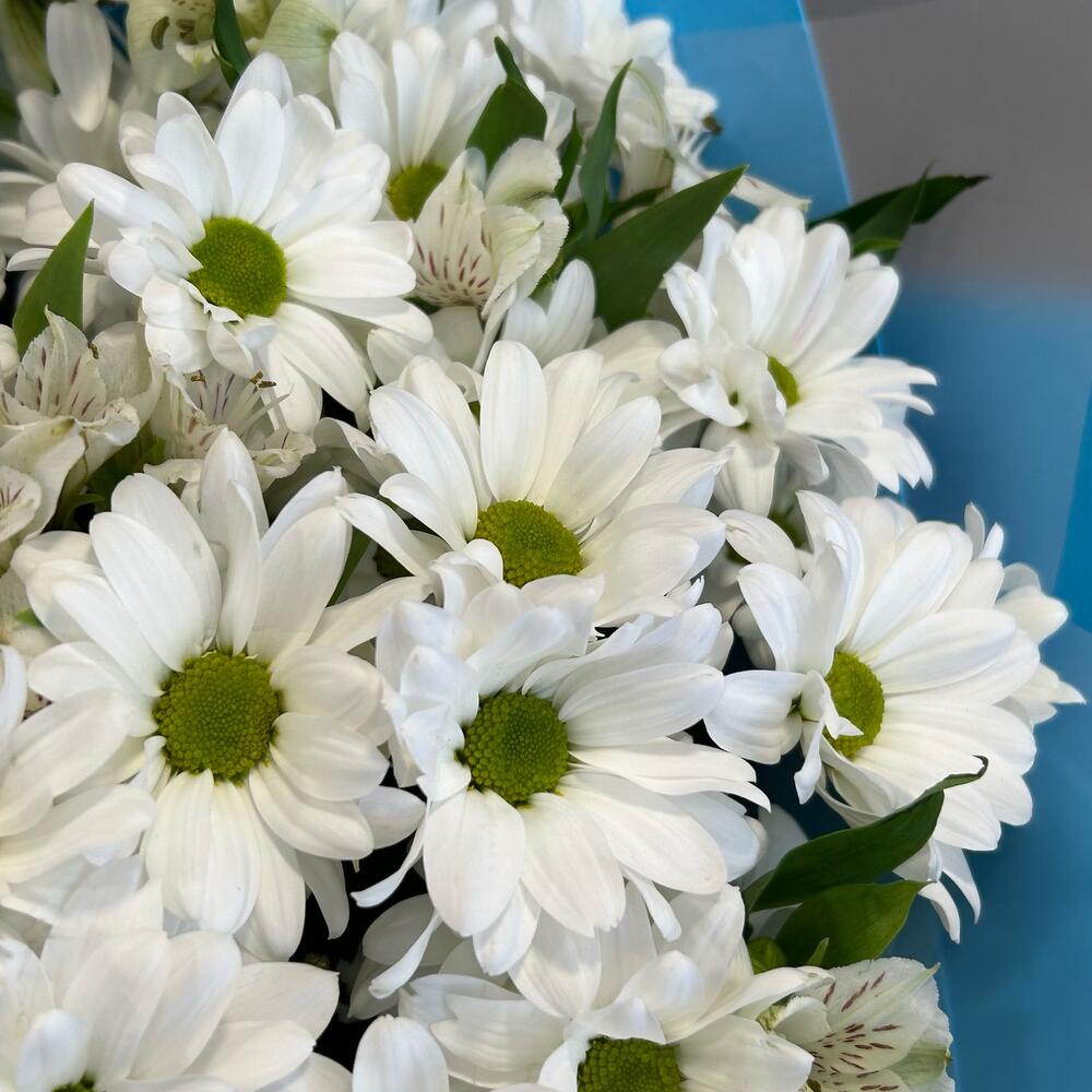 Альстромерия – 6 шт.Хризантема кустовая – 5 шт.Лента атласная – 2 шт.Упаковка дизайнерская – 2 шт.