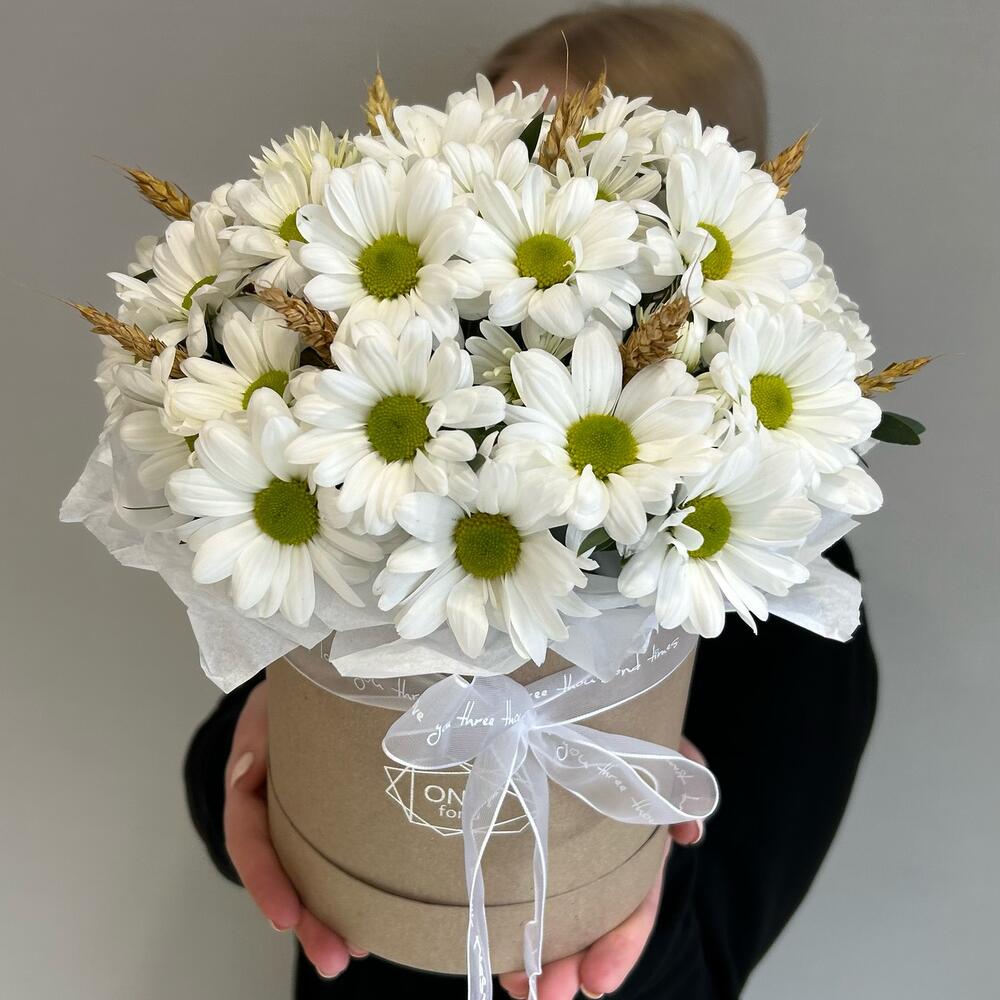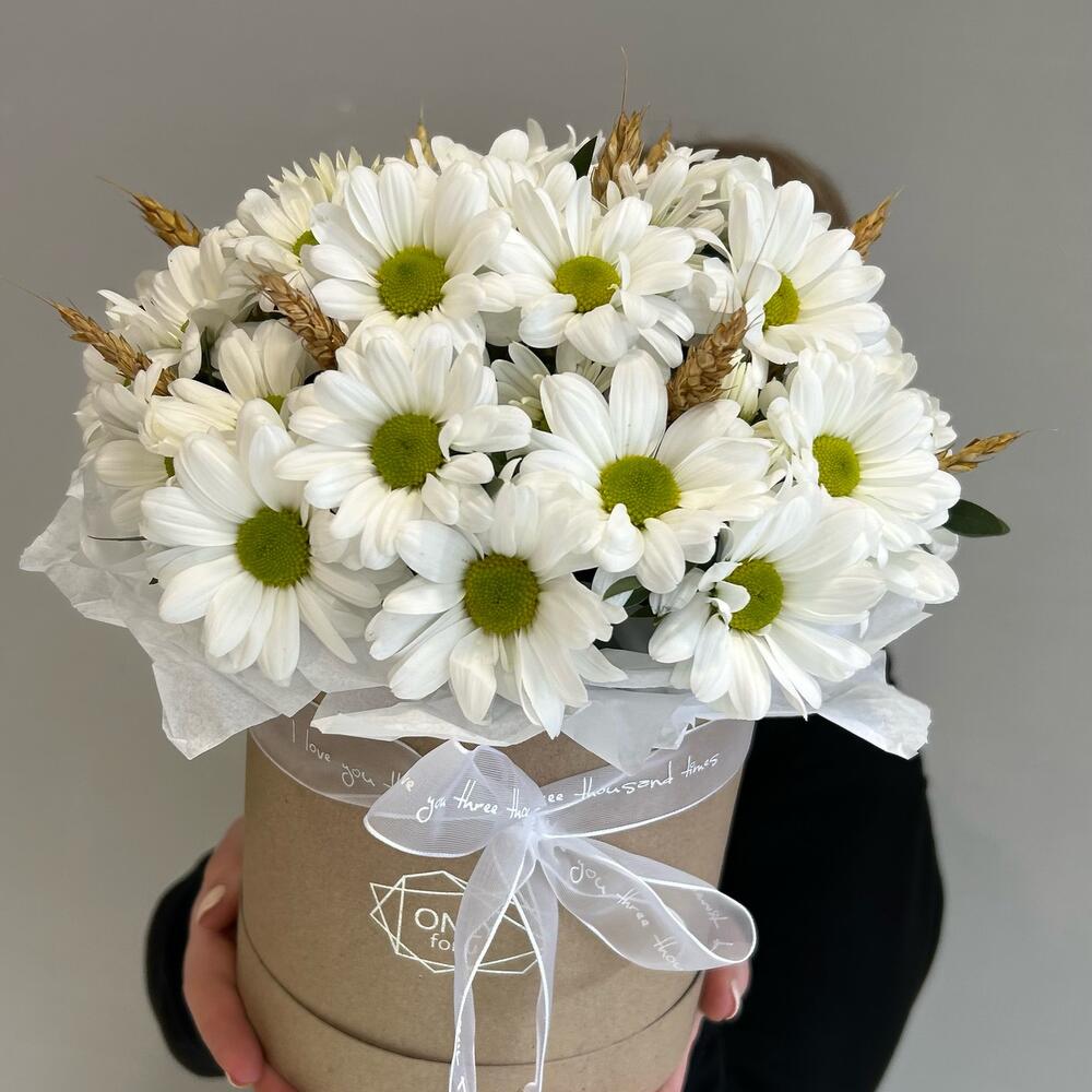 Пиафлор (оазис) – 1 шт.Хризантема кустовая – 5 шт.Зелень – 2 шт.Коробка шляпная – 1 шт.Пшеница – 10 шт.Упаковка дизайнерская – 2 шт.