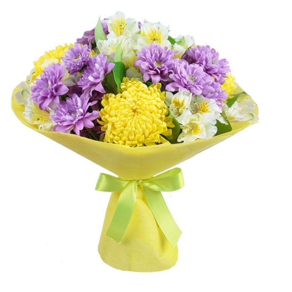 Листья салал – 1 шт.лента декоративная – 1 шт.Фетр – 1 шт.Альстромерия белая – 4 шт.Хризантема кустовая розовая – 3 шт.Хризантема одноголовая желтая – 3 шт.