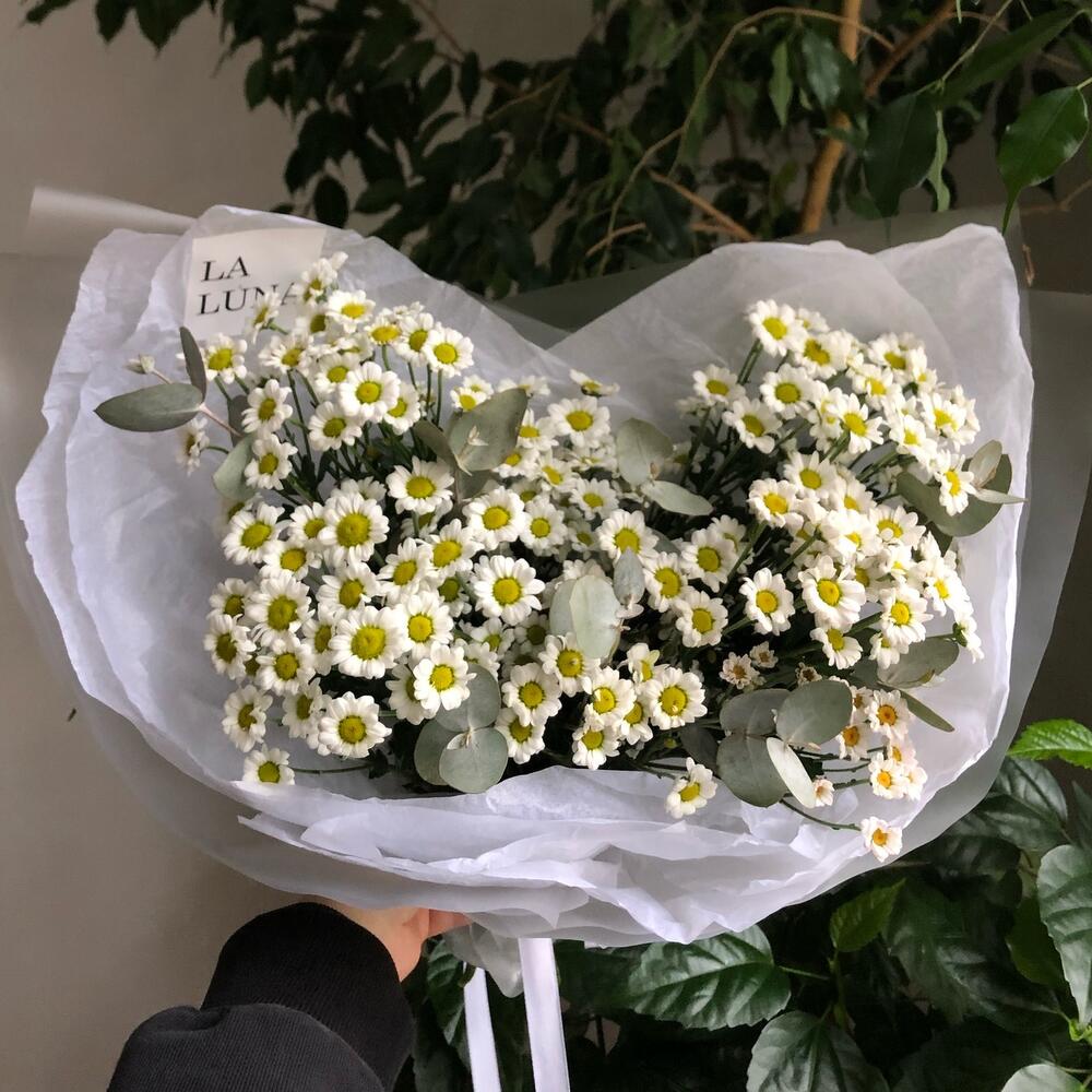 Хризантема Сантини – 7 шт.Лента атласная – 1 шт.Упаковка дизайнерская – 2 шт.Кризал (подкормка) – 1 шт.Аквапак – 1 шт.инструкция по уходу за цветами – 1 шт.транспортировочная упаковка – 1 шт.эвкалипт cineria пучок – 1 шт.