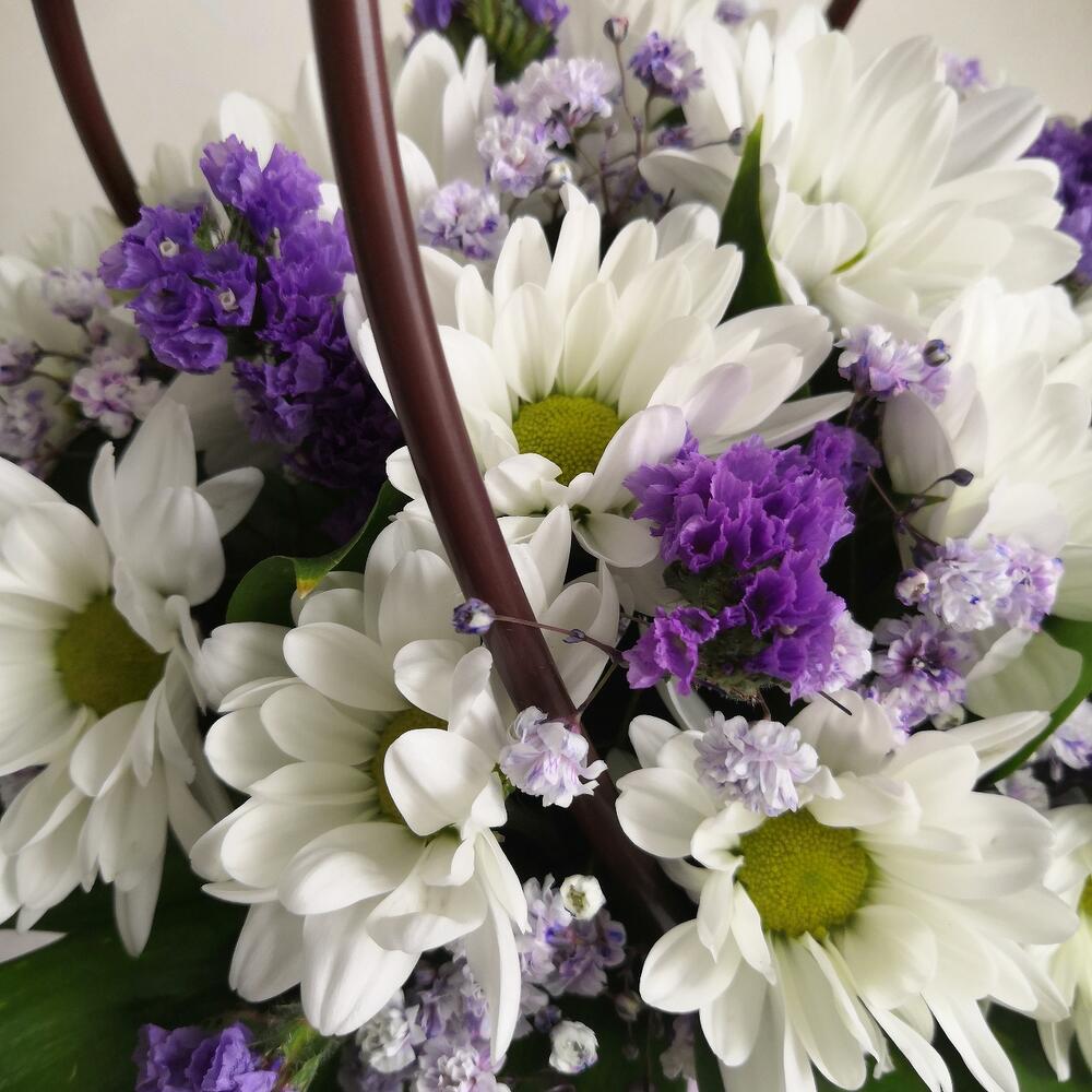 Ромашковидные хризантемы в сочетании с фиолетовой статицей в сиреневой сумочке для Вас.Свежие долгоиграющие цветы.