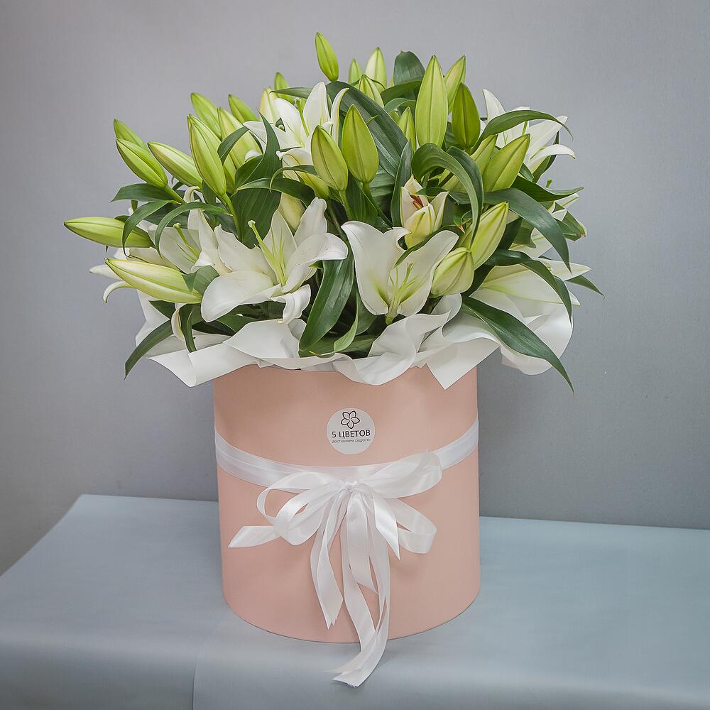 Букет из 11 белых лилий в шляпной коробке