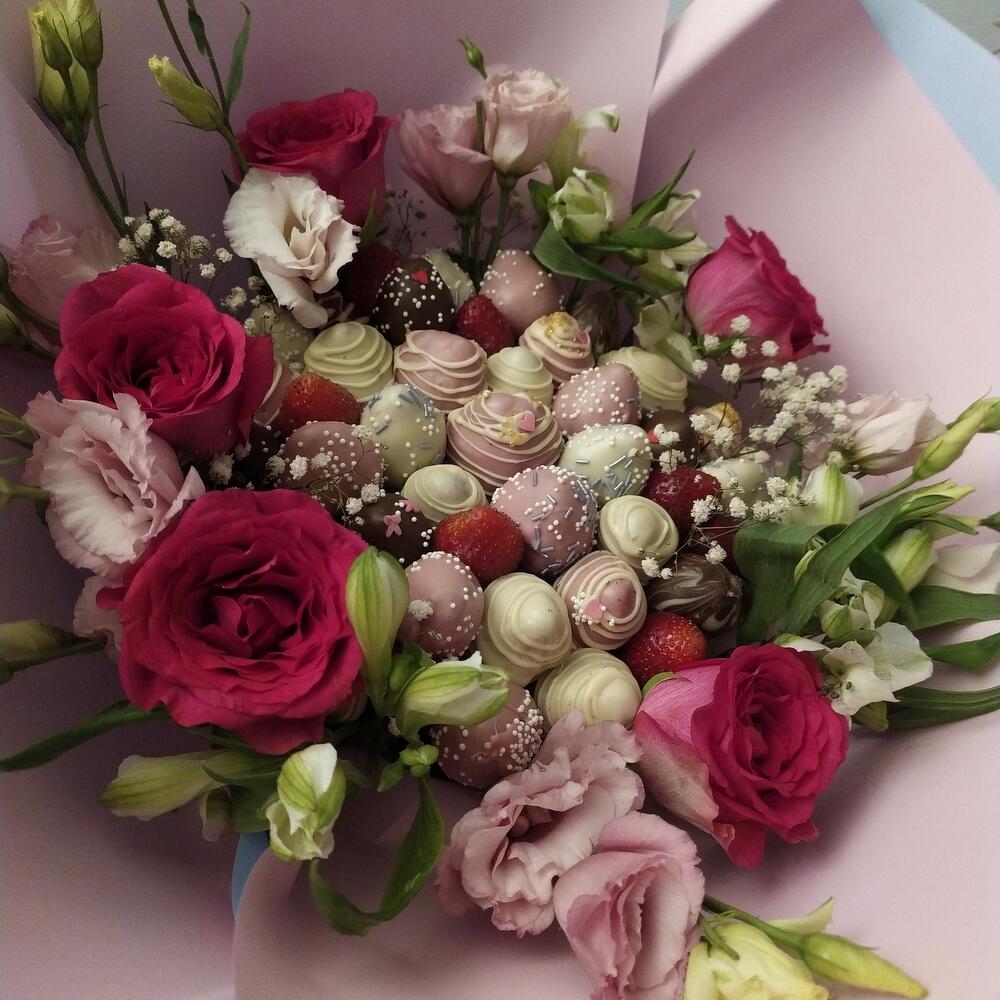 Альстромерия – 3 шт.Клубника – 8 шт.Лизиантус – 6 шт.Клубника в шоколаде callebaut (бельгия) – 30 шт.Дизайнерская упаковка – 1 шт.розы алые 60 см – 5 шт.