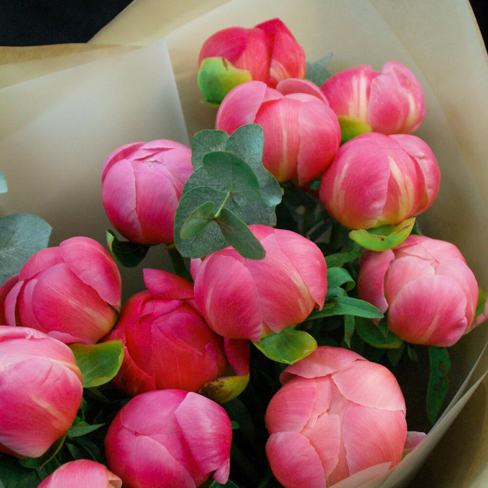 Пион Коралл Шарм (Coral Charm) – 15 шт.Эвкалипт – 4 шт.Дизайнерская упаковка – 1 шт.