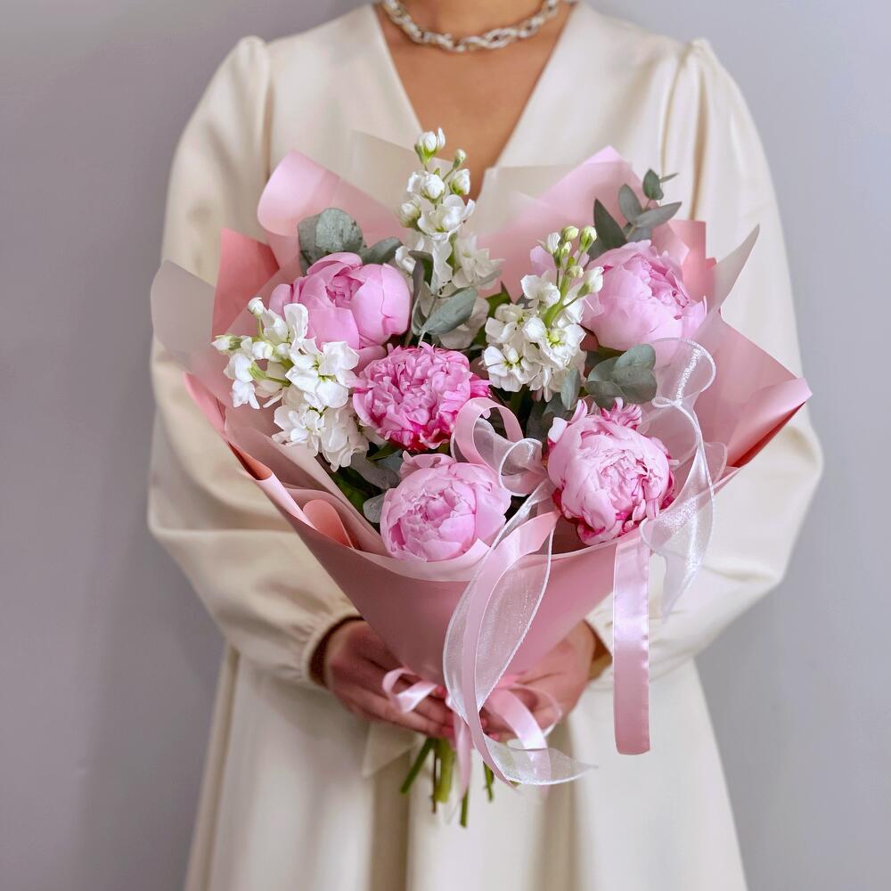 Эвкалипт – 1 шт.Упаковка дизайнерская – 1 шт.Маттиола белая – 3 шт.пионы розовые премиум – 5 шт.