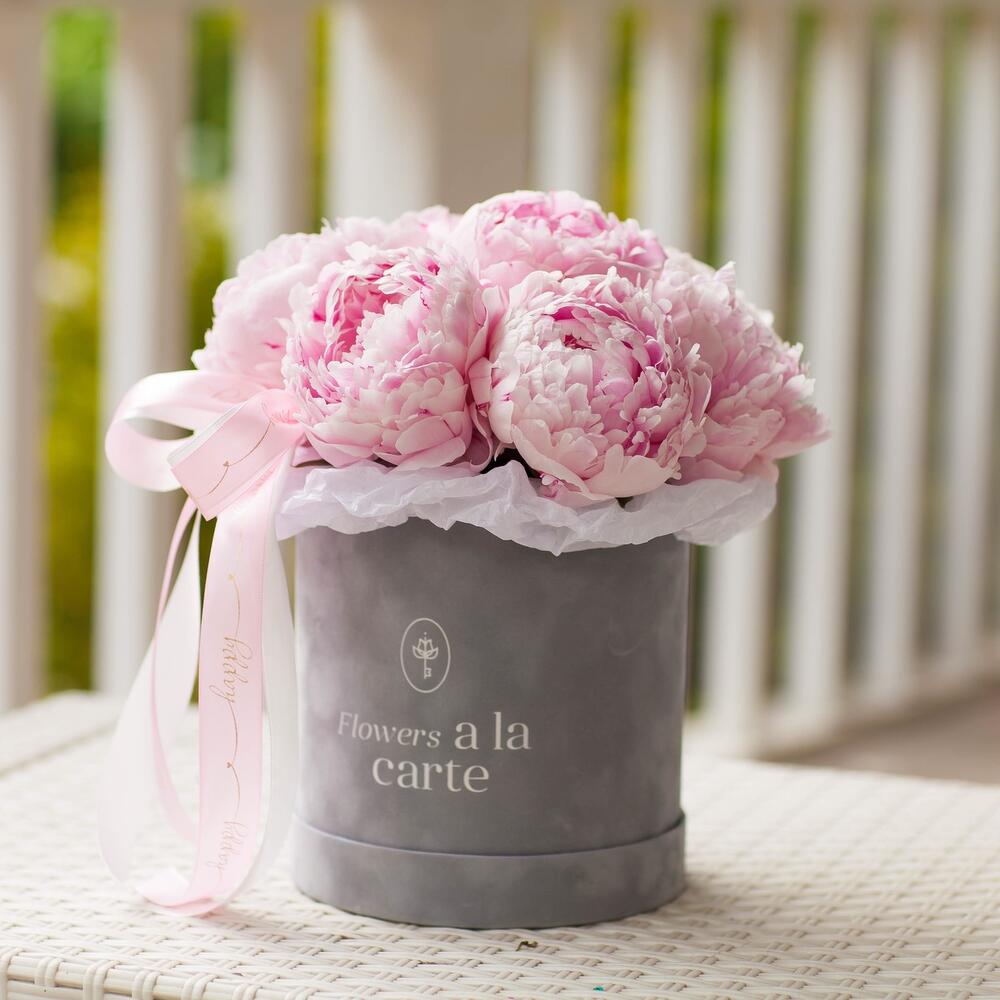 Лента атласная – 1 шт.Тишью – 1 шт.Бархатная коробка – 1 шт.Пион розовый – 7 шт.Оазис флористический – 1 шт.