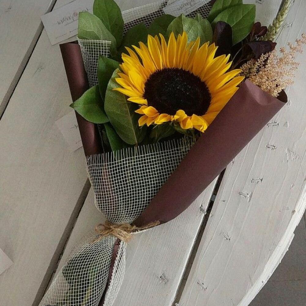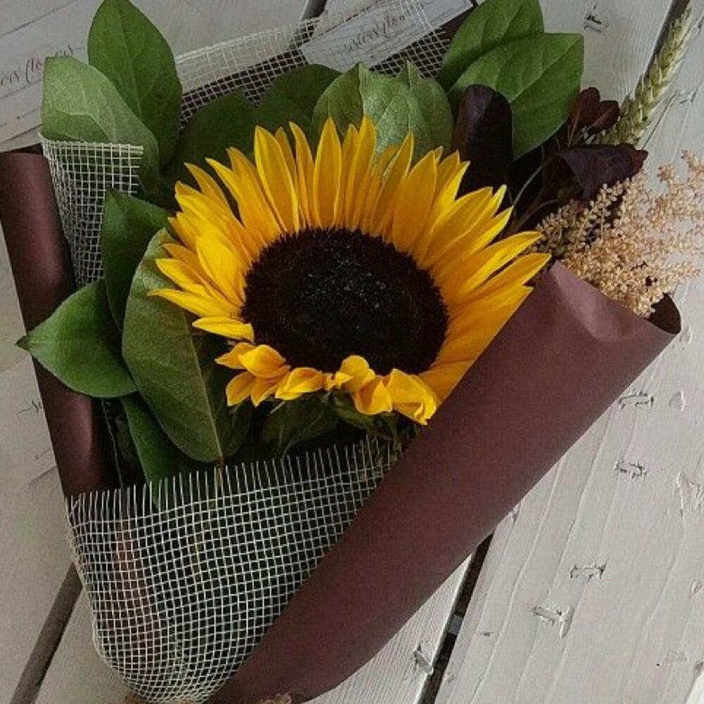 Подсолнух – 1 шт. Упаковка дизайнерская – 1 шт. декоративная зелень – 5 шт.