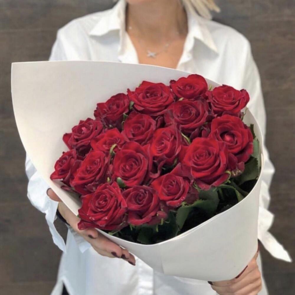 Голландская роза – 21 шт. Открыточка с вашими пожеланиями – 1 шт. бумага дизайнерская – 1 шт.