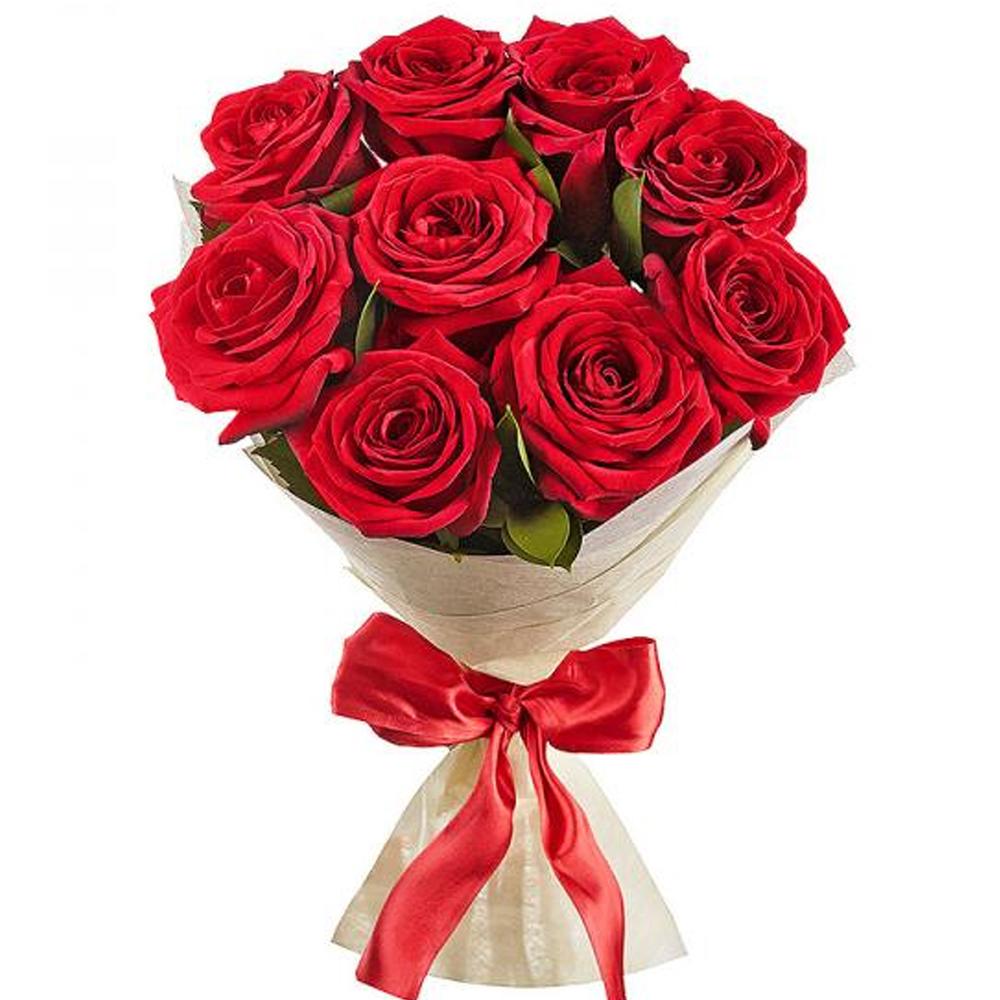 Рускус – 5 шт.Фетр – 1 шт.Атласная лента – 1 шт.Роза красная 50 см – 9 шт.