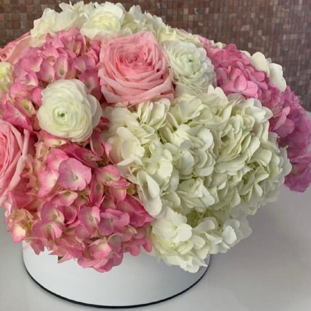 ассорти гортензий – 7 шт.Роза розовая – 5 шт.Ранункулюс – 5 шт.Коробка шляпная – 1 шт.Лента атласная – 1 шт.Открытка – 1 шт.инструкция по уходу за цветами – 1 шт.хорошее настроение – 100 шт.Кризал – 1 шт.