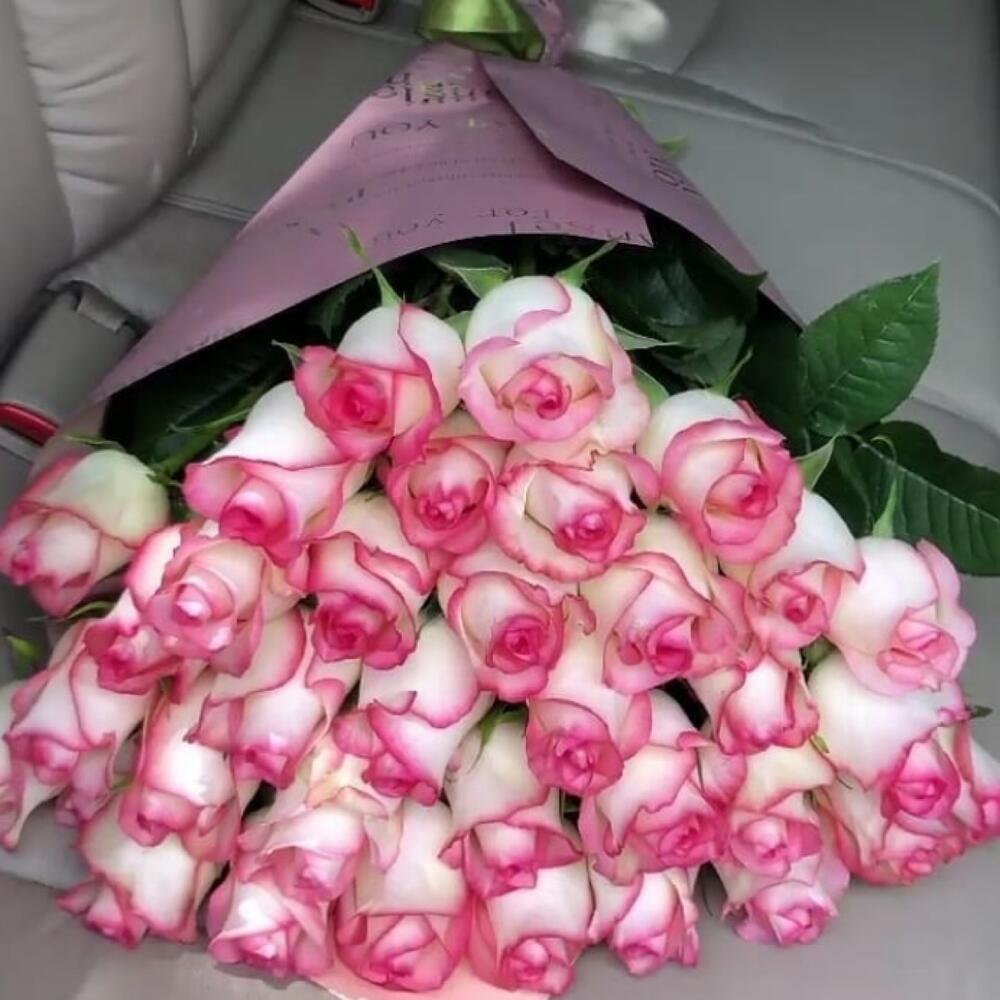 бело розовые розы – 19 шт. Атласная лента – 1 шт.