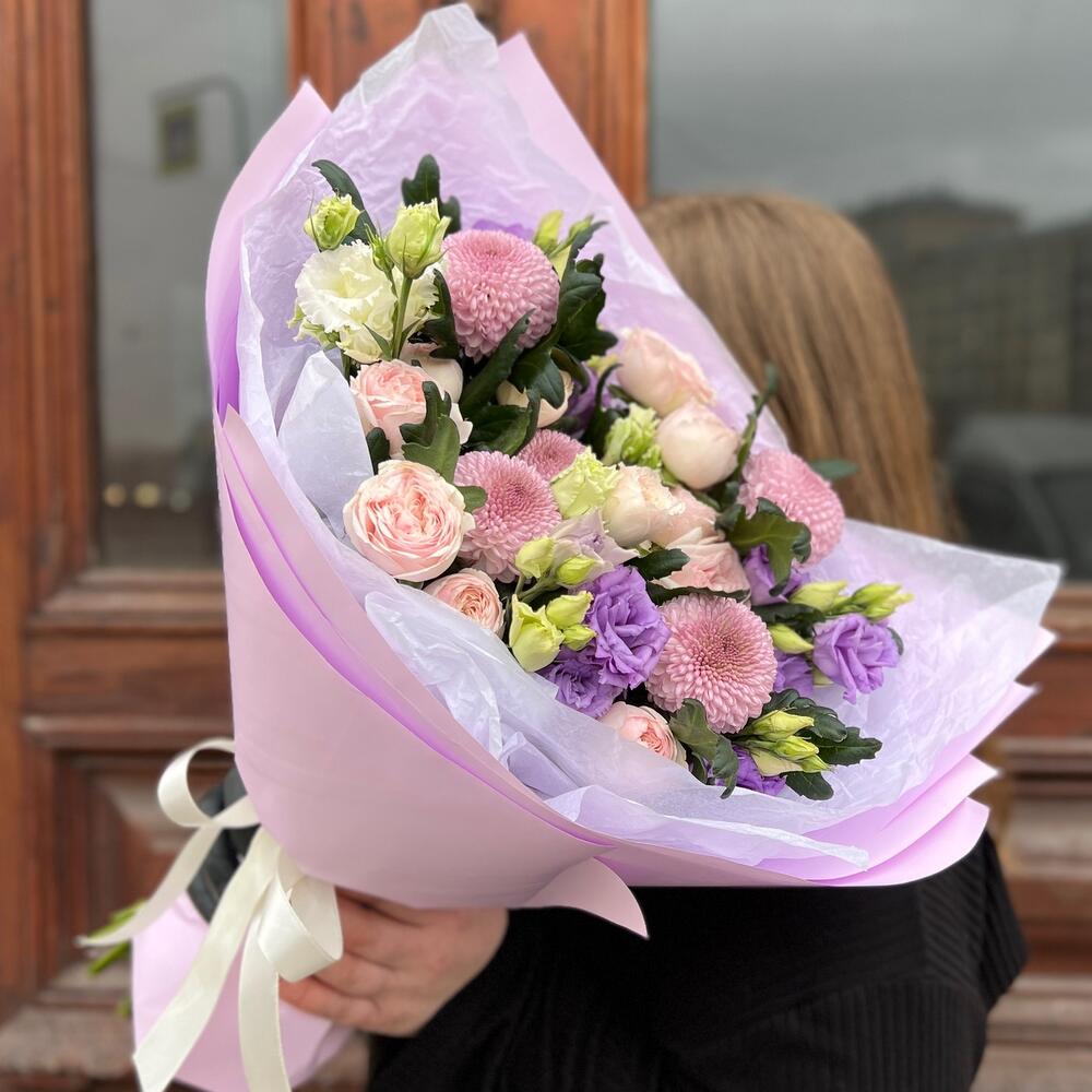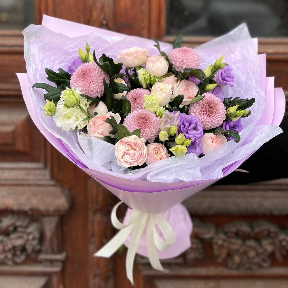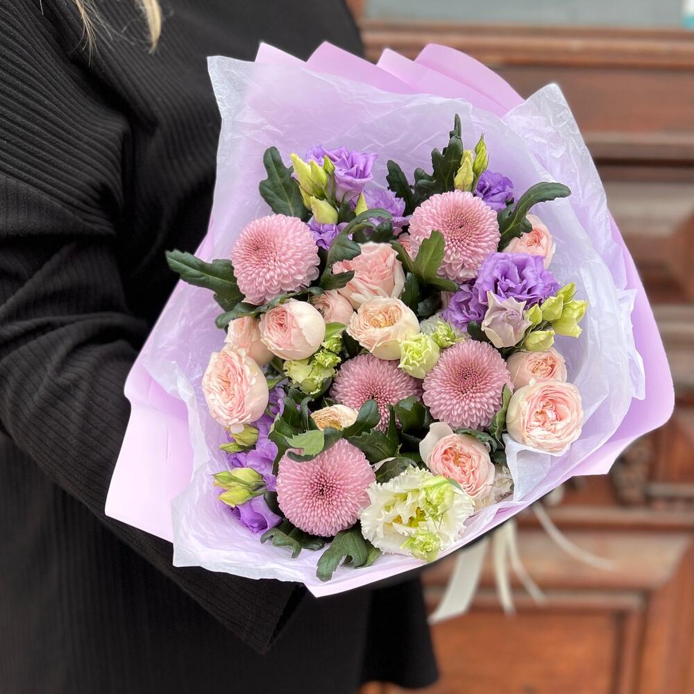 роза пионовидная кустовая мэнсфилд парк – 3 шт.Хризантема момоко – 5 шт.эустома лавандовая – 3 шт.Эустома белая махровая – 1 шт.Тишью белое – 2 шт.Пленка матовая – 3 шт.Лента атласная – 2 шт.