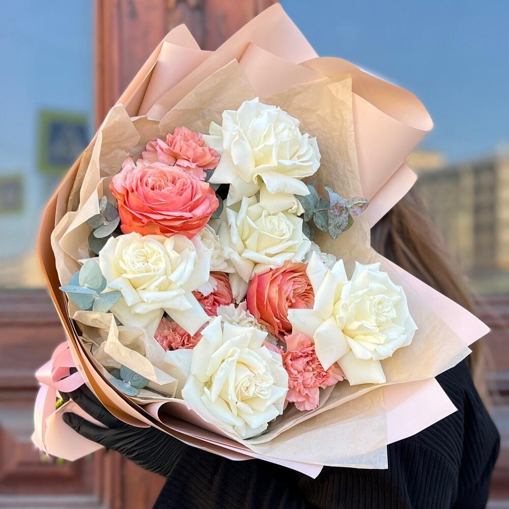 Эвкалипт – 3 шт.Лента атласная – 2 шт.Тишью – 3 шт.Диантус – 6 шт.Пленка матовая – 5 шт.Роза пионовидная кахала – 3 шт.роза пионовидная плайя бланка – 5 шт.
