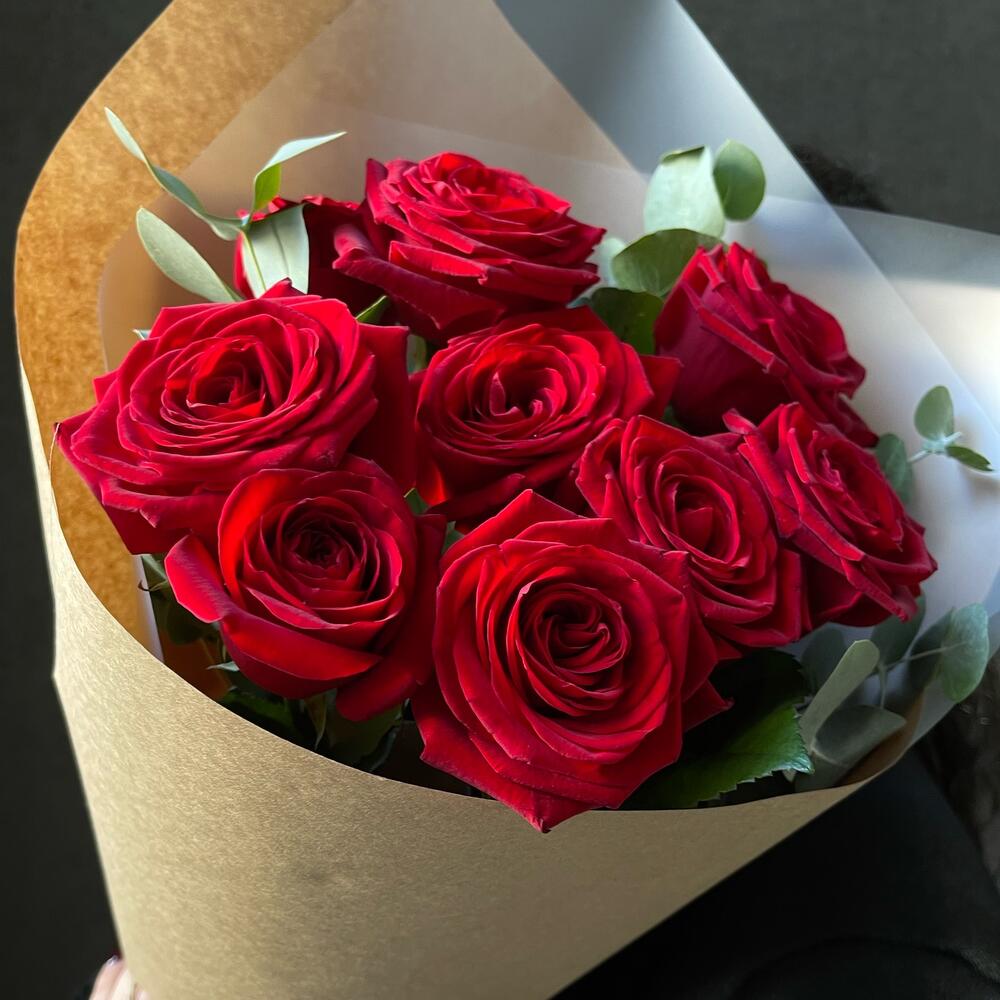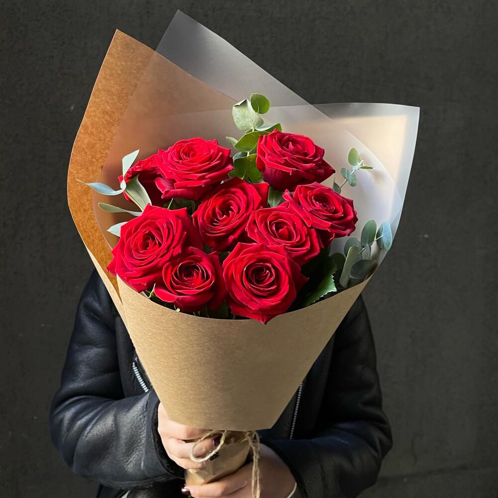 Букет 17: 9 красных роз с эвкалиптом