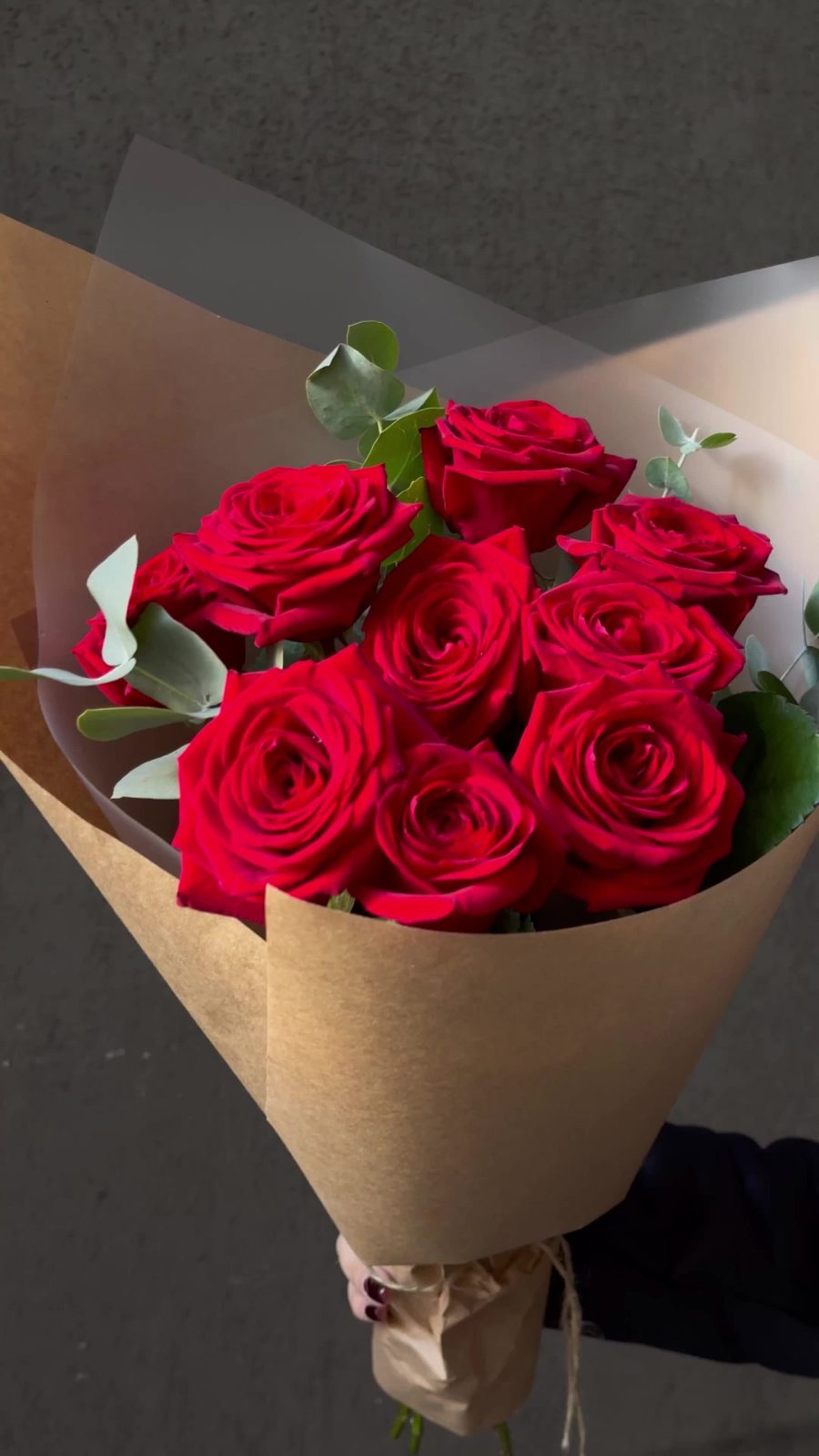 Эвкалипт – 3 шт.Упаковка дизайнерская – 3 шт.Роза красная 50 см – 9 шт.