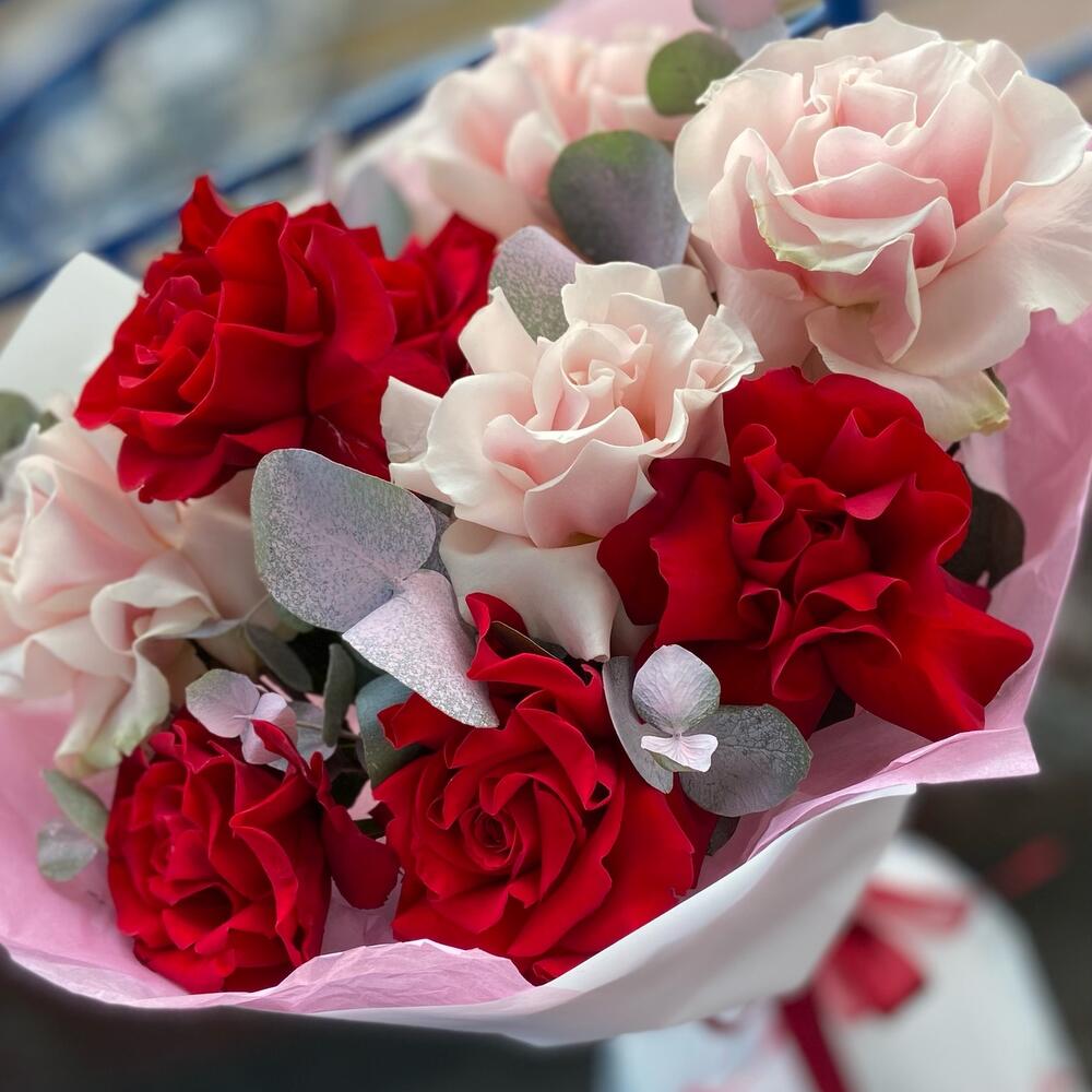 Французская роза – 9 шт. Эвкалипт – 1 шт. Упаковка дизайнерская – 1 шт.