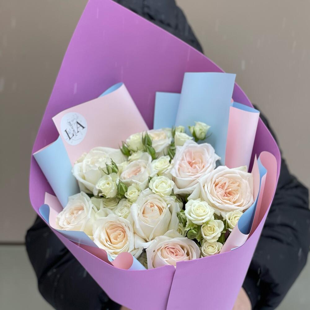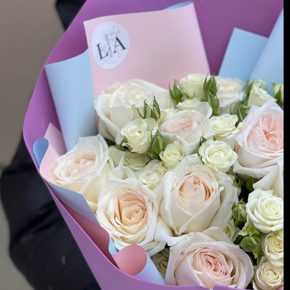 Роза кустовая – 4 шт.Упаковка дизайнерская – 4 шт.лента фирменная – 2 шт.Фоамиран (упаковка) – 1 шт.white o’hara пионовидная роза – 9 шт.