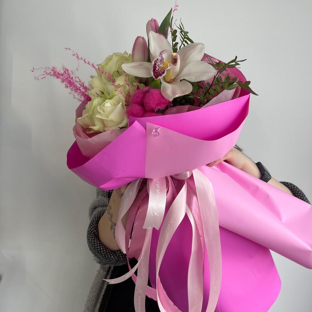 Роза – 6 шт.Тюльпан – 3 шт.Хлопок натуральный – 1 шт.Орхидея Цимбидиум – 1 шт.Тишью – 4 шт.Пленка матовая – 4 шт.Лента атласная – 4 шт.мискантус розовый – 1 шт.