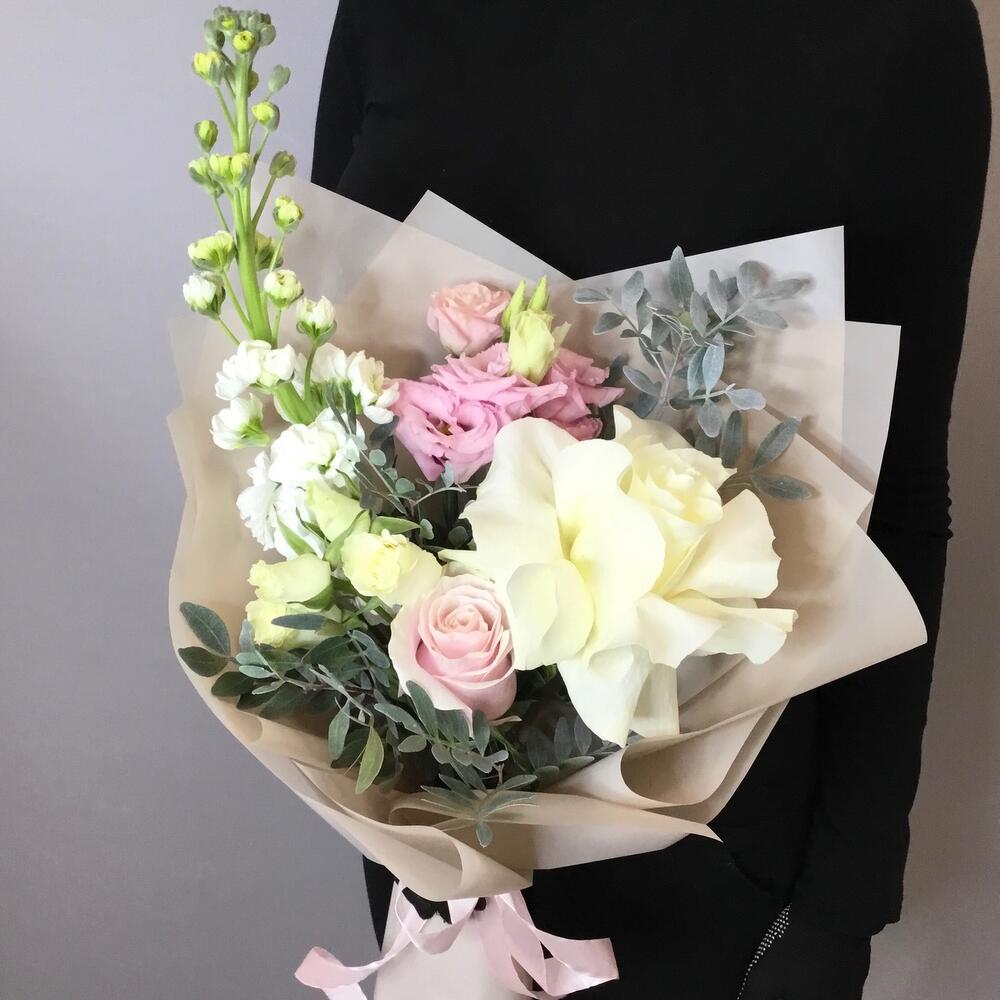 Маттиола – 1 шт.Кустовая роза – 1 шт.Роза Эквадор – 1 шт.Эустома – 1 шт.Лента атласная – 1 шт.Фисташка – 2 шт.Французская роза – 1 шт.Пленка матовая – 1 шт.подкормка для срезанных цветов – 1 шт.