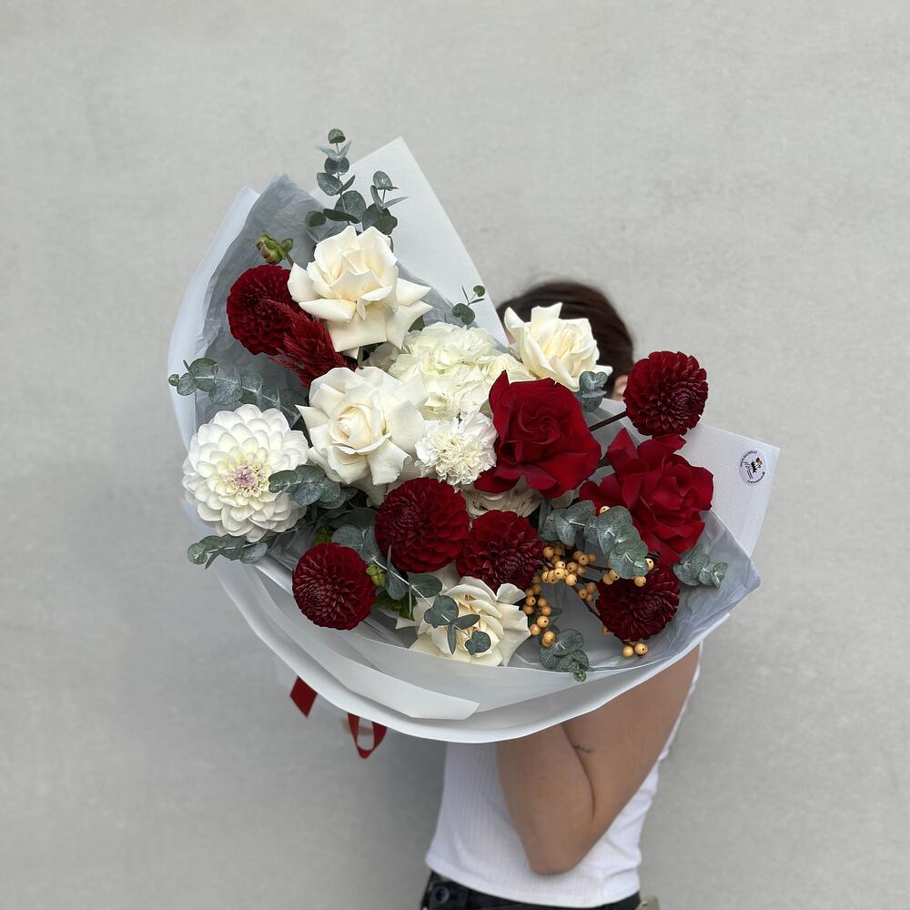 Гортензия – 1 шт. Роза – 6 шт. георгины – 1 шт. Илекс – 1 шт. Гвоздика – 1 шт. Эвкалипт – 1 шт.