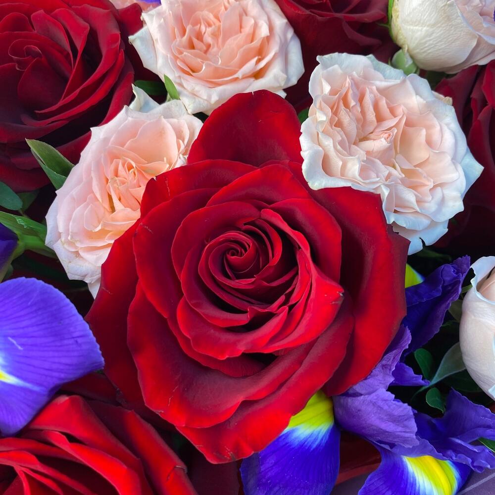 Роза красная Эквадор – 5 шт.ирис синий голландия – 5 шт.Роза кустовая – 3 шт.зелень декоративная – 2 шт.Упаковка дизайнерская – 2 шт.