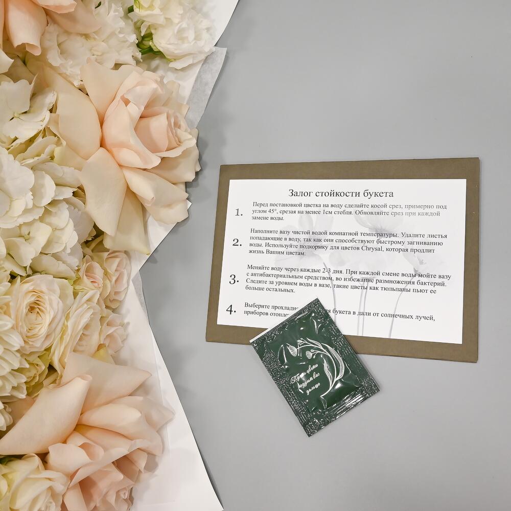 - Сроки возврата: Претензии по качеству букета принимаются в течение 24 часов с момента его получения.