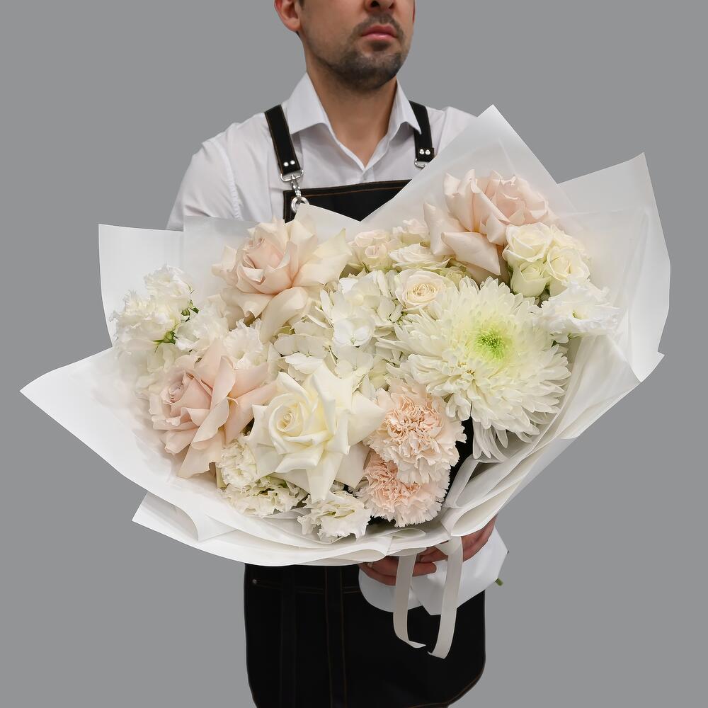 Гортензия – 1 шт.Хризантема – 1 шт.Французская роза – 4 шт.Гвоздика – 2 шт.Эустома – 2 шт.Кустовая пионовидная роза – 2 шт.