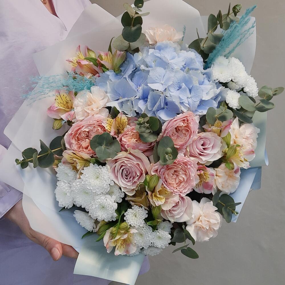 Гортензия – 1 шт.Роза – 3 шт.Роза кустовая пионовидная – 1 шт.Диантус – 5 шт.Альстромерия – 3 шт.Сантини – 3 шт.Эвкалипт – 4 шт.ветки декоративные – 2 шт.Рускус – 15 шт.Упаковка дизайнерская – 3 шт.Лента атласная – 1 шт.