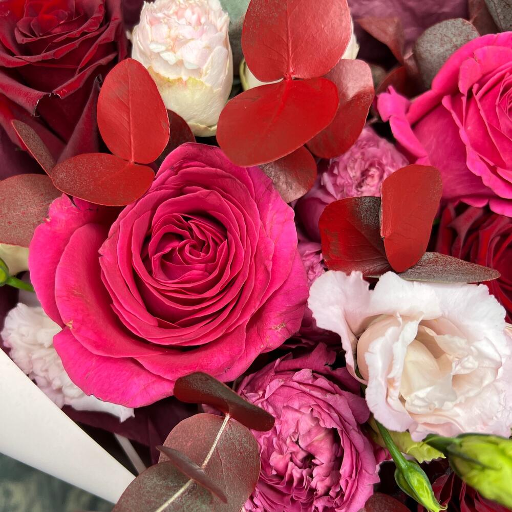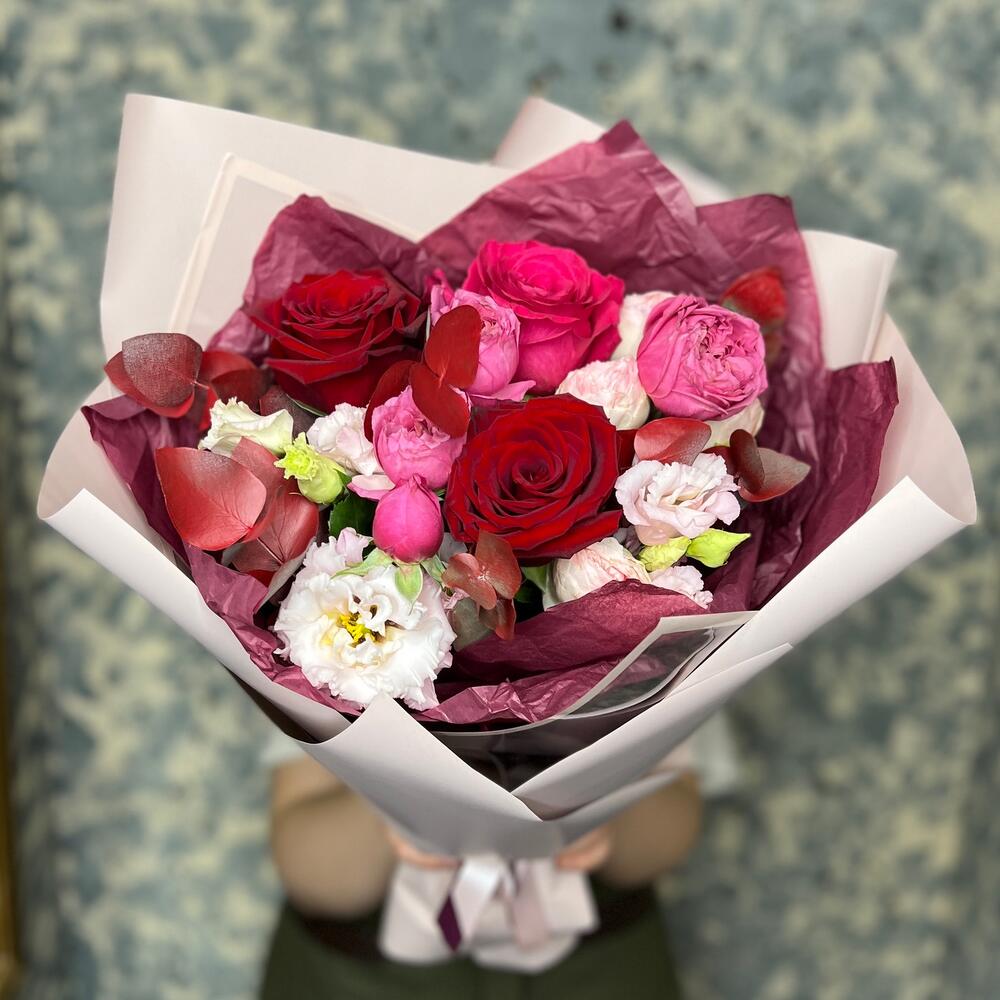 Роза Pink Floyd – 1 шт.Роза Эксплорер – 2 шт.роза кустовая пионовидная джульетта церайз – 1 шт.роза кустовая пионовидная мэнсфилд парк – 1 шт.эустома розовая – 1 шт.Эвкалипт – 1 шт.Тишью – 2 шт.Пленка матовая – 5 шт.Лента атласная – 2 шт.