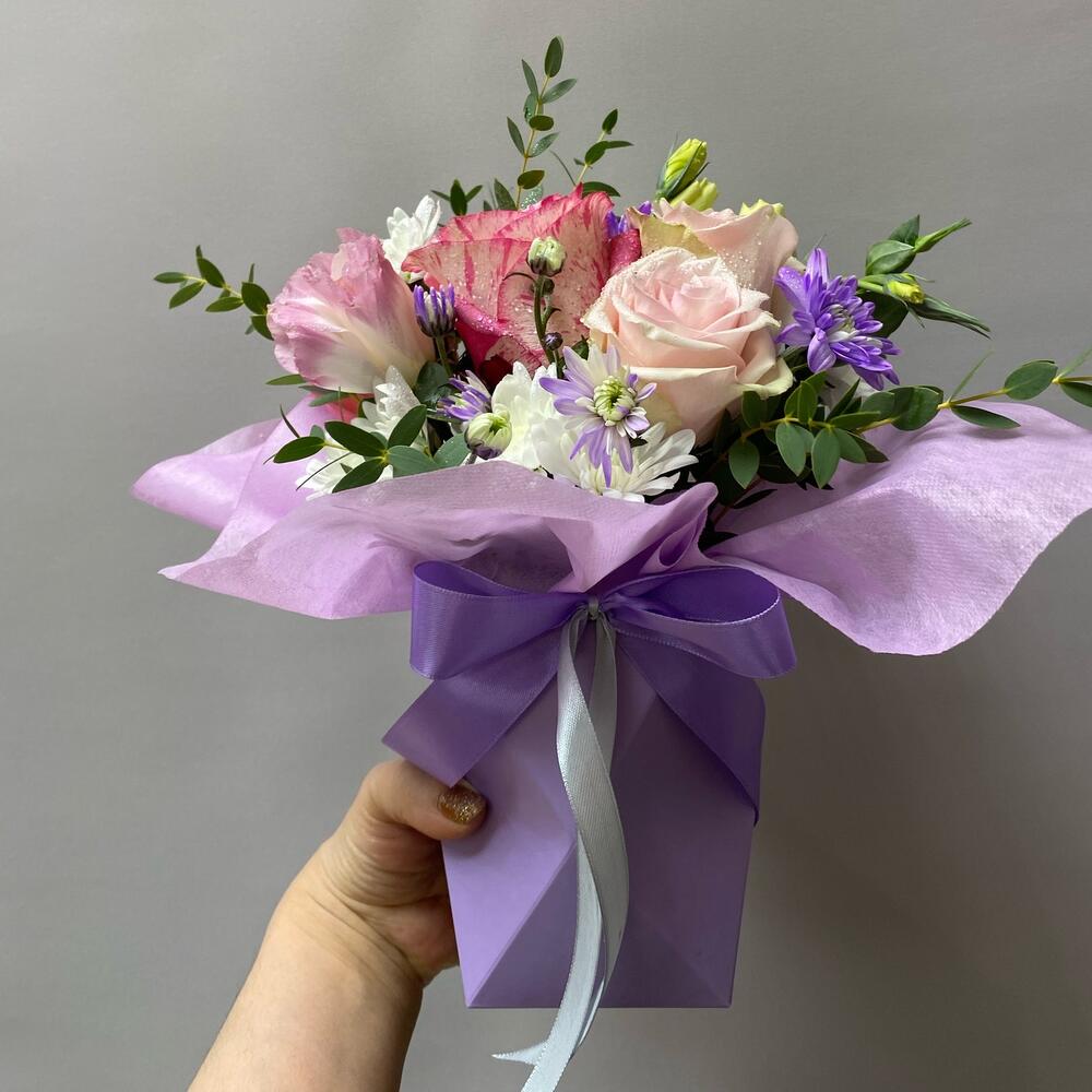 Роза – 3 шт.Хризантема кустовая – 2 шт.Эвкалипт – 1 шт.Упаковка – 2 шт.