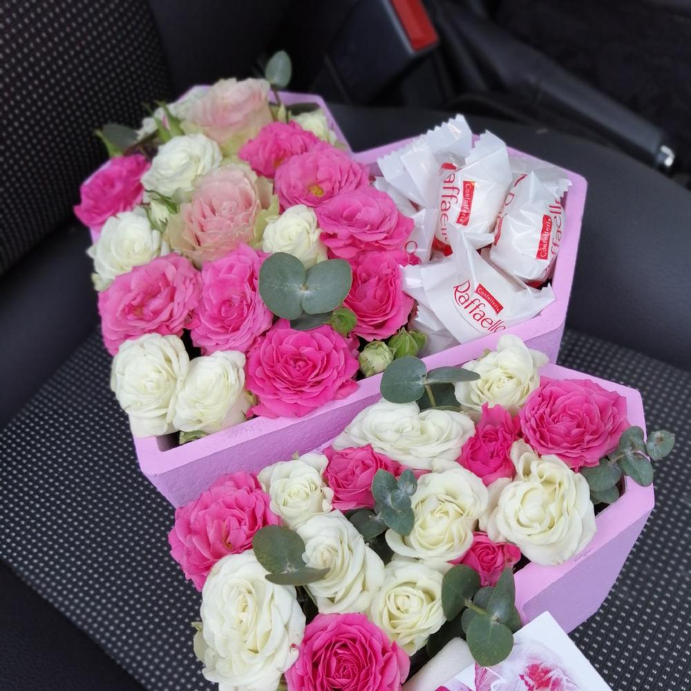 Коробка сердце – 1 шт.Флористическая губка – 1 шт.Роза одноголовая – 3 шт.Роза кустовая – 5 шт.Эвкалипт – 1 шт.Карточка для подписи – 1 шт.рафаело конфеты – 15 шт.