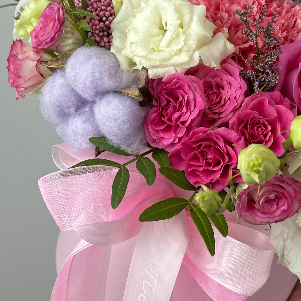 Коробка шляпная – 1 шт.Оазис флористический – 1 шт.Орхидея Цимбидиум – 3 шт.Роза Россия – 3 шт.Кустовая роза – 5 шт.эустома белая – 1 шт.Хлопок натуральный – 3 шт.Диантус – 7 шт.Фисташка пучок – 1 шт.Озотамнус розовый – 1 шт.лимуниум – 1 шт.