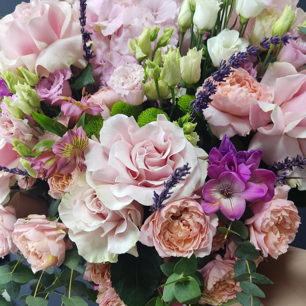 Альстромерия – 8 шт.Лизиантус – 6 шт.Фрезия – 7 шт.Роза французская – 8 шт.Пионовидная кустовая роза – 8 шт.Гортензия розовая – 1 шт.Эвкалипт Синерия – 7 шт.филин грин хризантема – 6 шт.