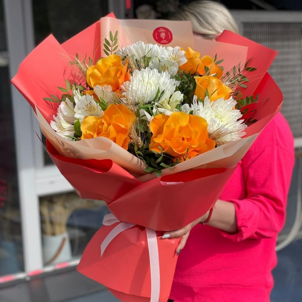 Альстромерии, Гвоздики, Кустовые розы, Лизиантусы, Розы, Хризантемы
