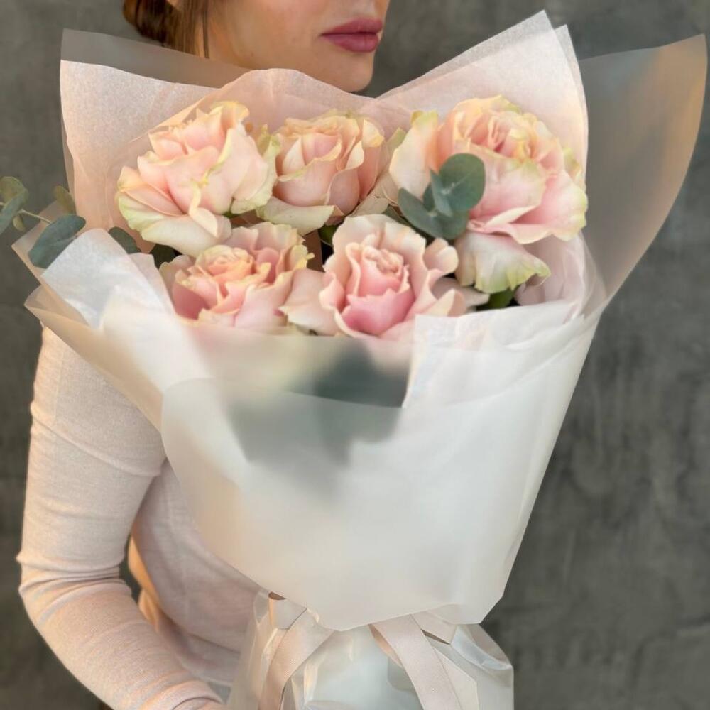 Ажурные нежно-розовые розы с эвкалиптом в элегантной матовой упаковке. Особая техника обработки делает бутон больше обычного. Стойкость таких бутонов, как у садовой пионовидной розы 3-5 дней.