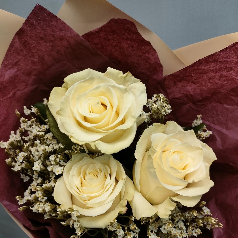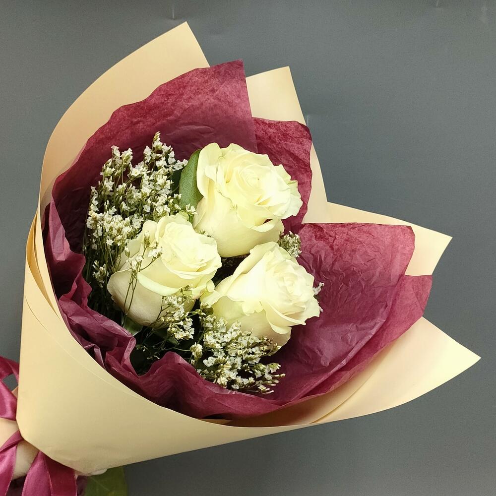Лимониум – 2 шт.Тишью – 1 шт.Роза Эквадор белая – 3 шт.Пленка матовая – 1 шт.