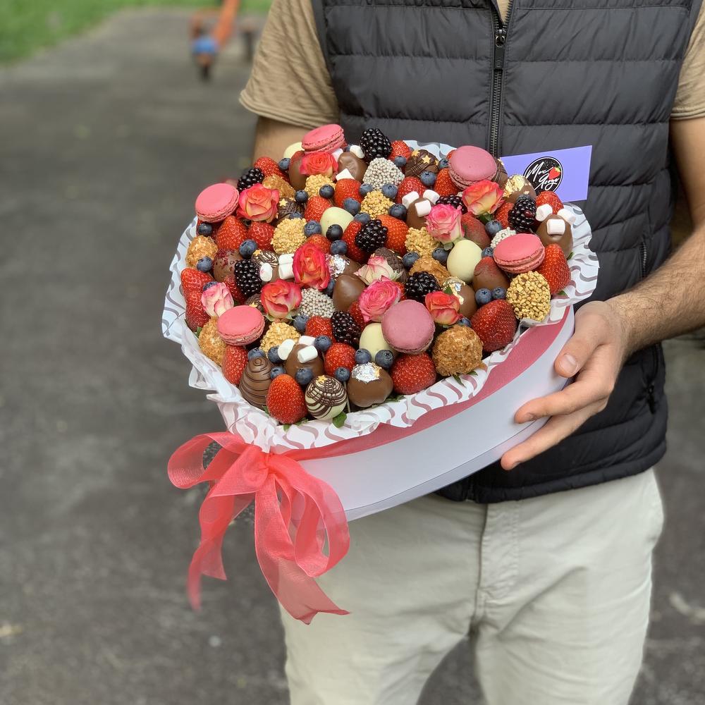 Клубника (шт) – 80 шт.Голубика – 300 гр.Кустовая роза – 5 шт.Коробка сердце – 1 шт.Макарон – 6 шт.Ежевика – 200 гр.