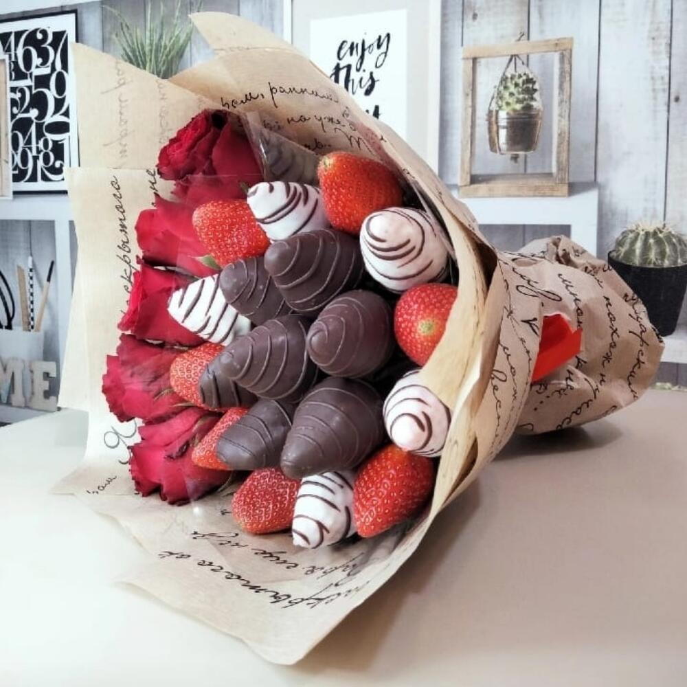 Роза – 5 шт.Клубника в шоколаде – 12 шт.Клубника – 7 шт.