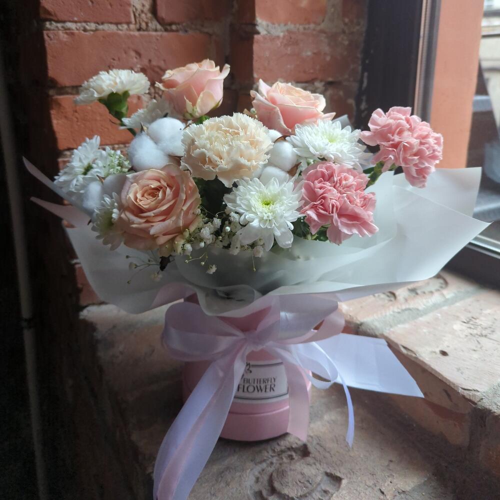 Роза – 3 шт.Хризантема кустовая – 2 шт.Диантус – 4 шт.Хлопок – 3 шт.Гипсофила – 1 шт.Коробка шляпная – 1 шт.Лента атласная – 2 шт.Самшит – 1 шт.Оазис флористический – 1 шт.