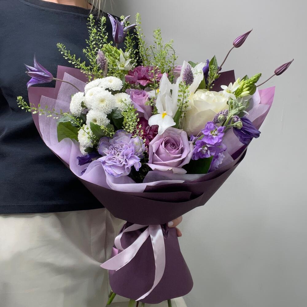 Ирис – 2 шт.Тласпи – 2 шт.Хризантема кустовая – 1 шт.Диантус – 3 шт.Орнитогалум – 2 шт.Роза сиреневая – 3 шт.Клематис – 2 шт.Фаларис – 3 шт.